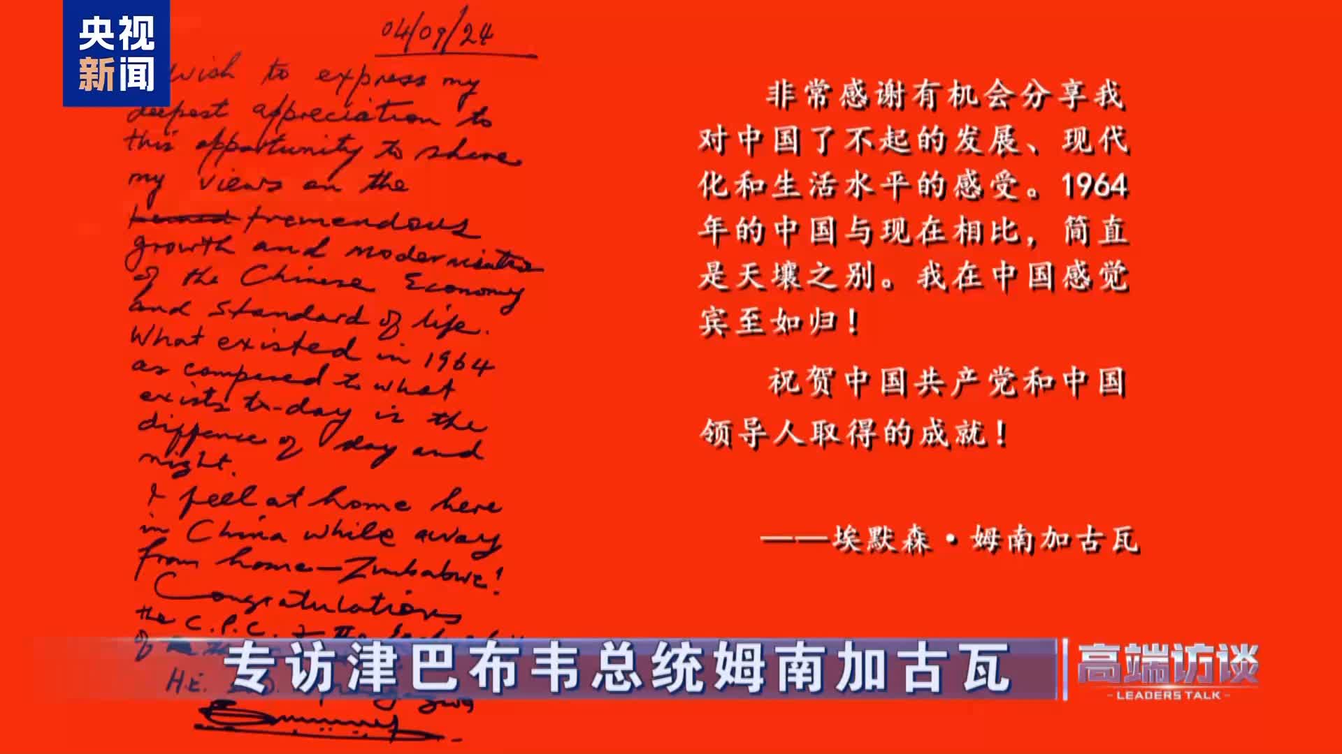在專訪中,姆南加古瓦表示,習近平主席提出的中津「五星鐵杆」合作架構充分體現了中國是津巴布韋發展和現代化進程中可以依靠的真朋友。他還表示,此次中非合作論壇峰會是一次十分寶貴的機會,讓中非領導人相聚北京,共同探討如果應對全球挑戰,共同擘畫中非未來合作新篇章。他期待將此行中的啟發與收穫融入本國的發展治理中,在共築高水平中非命運共同體的進程中與中國攜手同行!