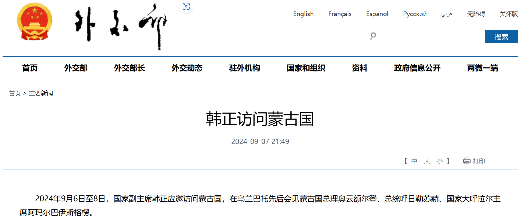 據外交部網站7日消息,9月6日至8日,國家副主席韓正應邀訪問蒙古國,在烏蘭巴托先後會見蒙古國總理奧雲額爾登、總統呼日勒蘇赫、國家大呼拉爾主席阿瑪爾巴伊斯格楞。
