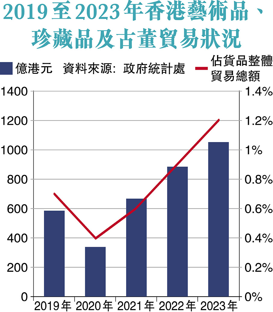 The Oneness Gallery畫廊負責 人陳嘉雯接受香港文匯報記者訪問時指出:「香港最大優勢是奉行低稅制,在英國要賣一幅畫予當地人,當地人要付20%增值稅,但在香港買畫則不用付增值稅,加上香港沒有遺產稅,又多國際藝術品拍賣行,流通性高,兼具背靠中國內地及聯通世界的地利優勢,令香港可以成為與紐約、倫敦齊名的國際三大藝術品市場之一。」根據特區政府數據顯示,過去五年(2019至2023年)香港藝術品、珍藏品及古董貿易總額大幅上升80%,由584.95億升至1,054.65億港元,佔貨品整體貿易總額的百分比由0.7%升至1.2%。