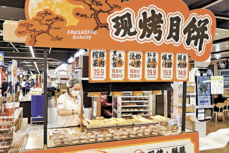 香港文匯報記者在深圳盒馬萬象食家店看到,在流心奶黃等基礎款之外,推出苔條果仁、椒鹽百果兩款淨素月餅,藥食同源的豆沙松子陳皮月餅,以及爆汁黑豬鮮肉月餅等手工月餅。盒馬今年還推出了個頭更小、餅皮更軟的芋泥麻薯小福餅,幾乎能做到「一口一個」,更適合日常的消遣食用。自8月1日上架以來,日銷量保持穩定增長。