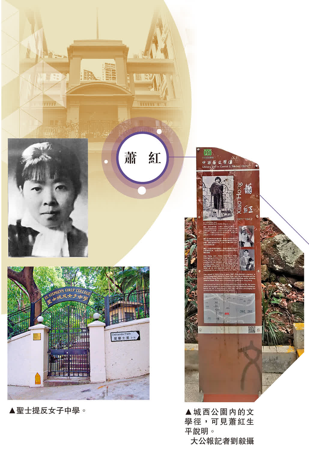 離開香港大學校園,沿着般咸道往上走,途經港鐵西營盤站C出口,繼續穿過柏道前行,可以見到聖士提反女子中學。學校雖然不對外開放,但這裏卻與作家蕭紅淵源匪淺。當年,這間如今看起來不顯山露水的學校是一家臨時救護站,蕭紅在此度過生命的最後歲月,於1942年病逝。