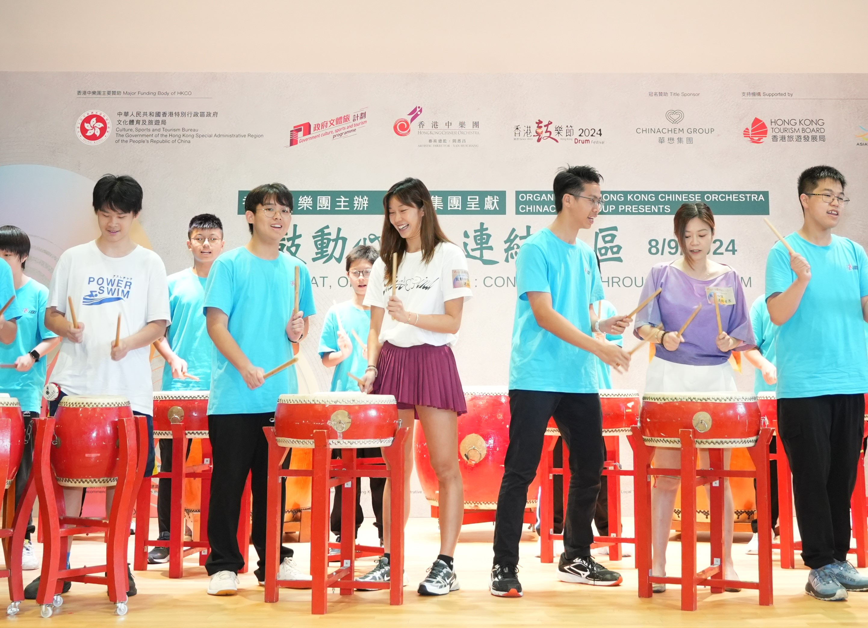 活動夥拍由3位奧運泳手歐鎧淳、鄭莉梅和楊珍美創辦的慈善組織Mind The Waves,攜手關注青少年的心理健康。歐鎧淳現場體驗鼓樂對身心靈帶來的裨益,以音樂推動共融,為社區帶來正能量。「共創明『Teen』計劃」成員在香港中樂團的導師帶領下,掌握擊鼓技巧,並作現場表演。