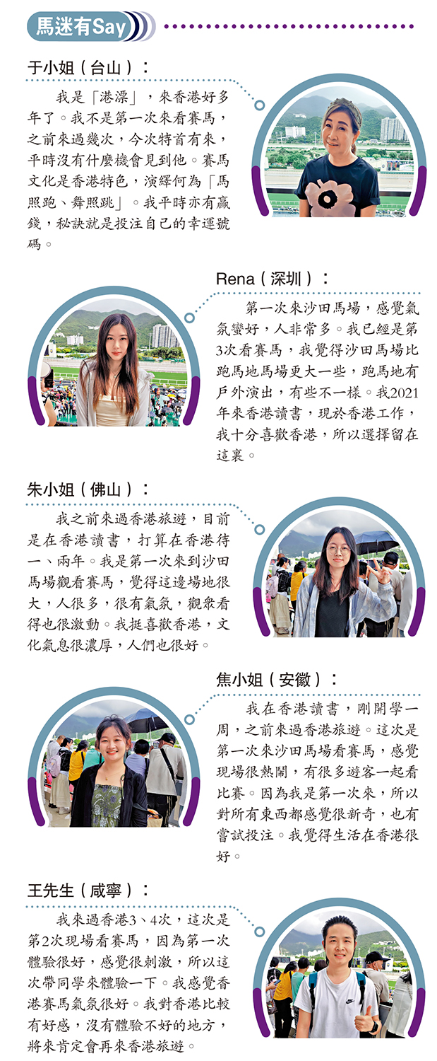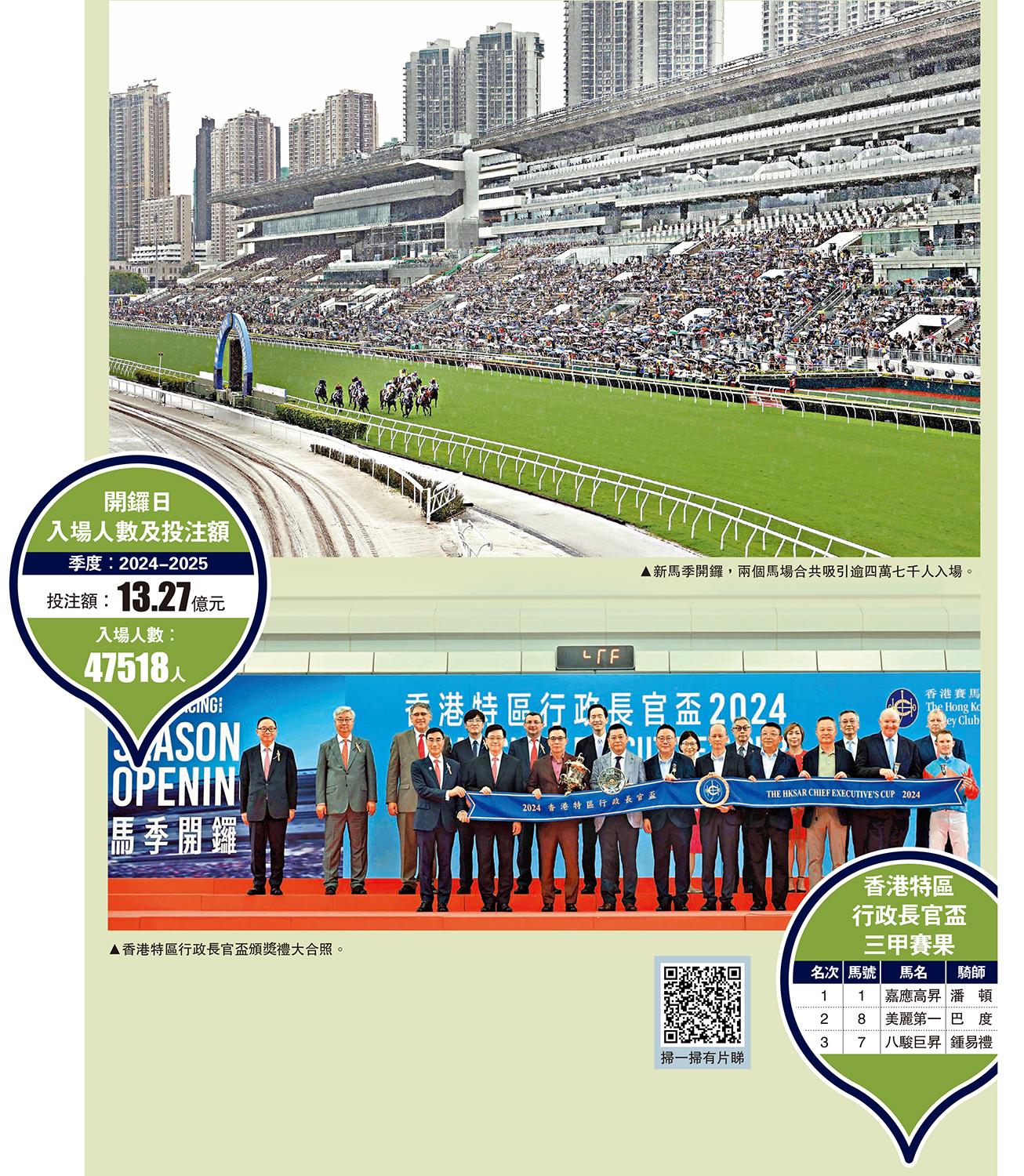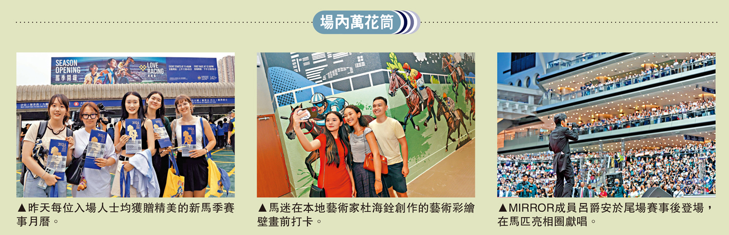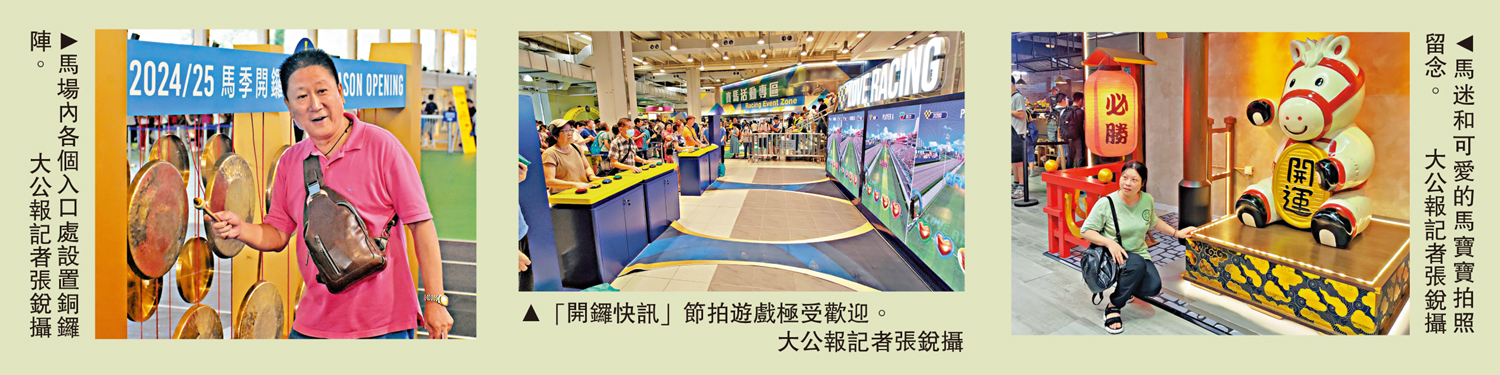 (大公報記者 朱家立、張銳)2024至2025年度香港賽馬季昨午在沙田馬場揭開帷幕,沙田馬場及跑馬地馬場合共47518名馬迷入場,創疫情後新高,當中包括逾7100名內地遊客,為歷來最高內地遊客入場紀錄。開季首日投注額13.27億元,較上季上升8.6%。另外,特首李家超為「香港特區行政長官盃」頒獎,騎師潘頓策騎的「嘉應高昇」勇奪殊榮。