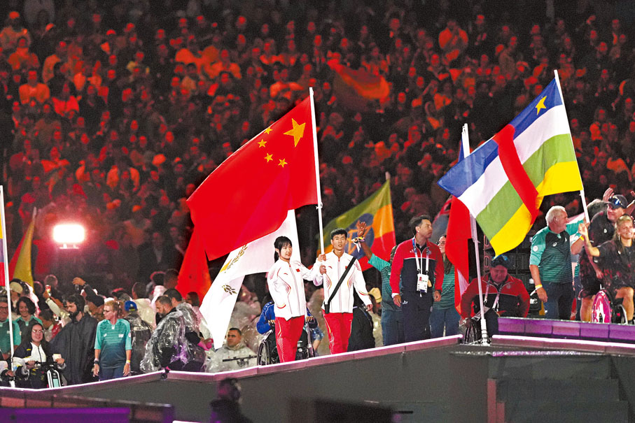 中國代表團旗手,是在本屆殘奧會上獨攬7面金牌的19歲游泳運動員蔣裕燕,以及在跳遠比賽中打破世界紀錄的田徑運動員邸東東。