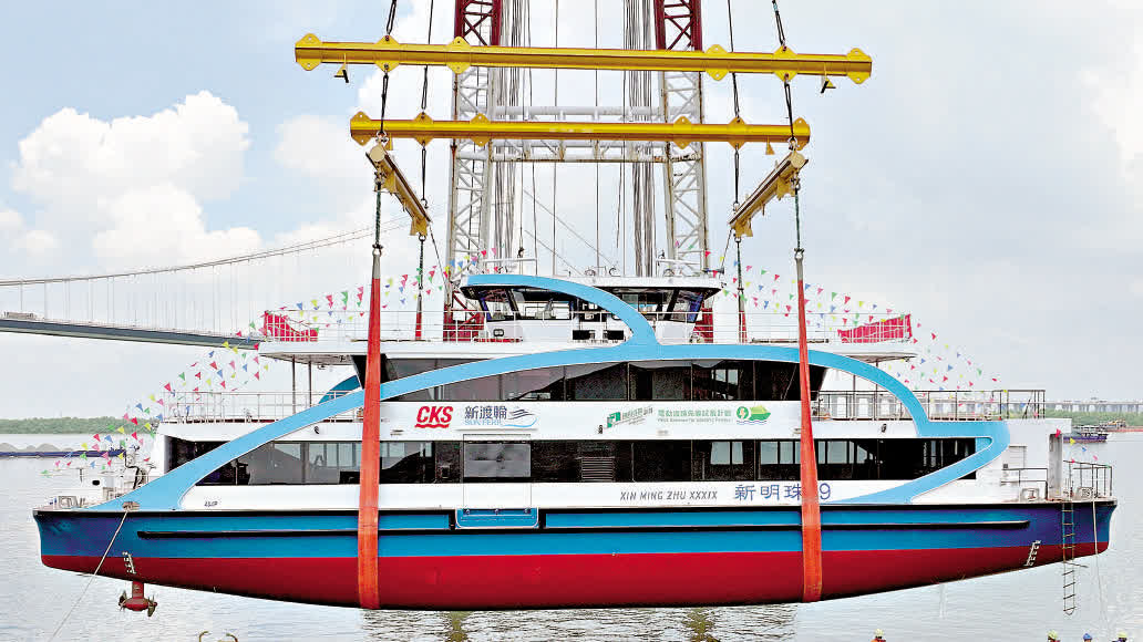 (大公報記者 方俊明 廣州報道)香港新渡輪400客位純電池動力推進渡輪「新明珠39」號下水儀式9日在廣州南沙舉行。該船全船採用先進的碳纖維高新材料製造,具有重量輕、耐腐蝕、噪音低等技術優勢,是目前香港首艘整船採用國產碳纖維材料建造的渡輪,打破了高端碳纖維進口材料在國產客船的技術壟斷局面。該船純電池動力推進,可以滿足「每天夜間充電,白天連續運營」要求,根據特區政府此前公布,很大可能服務於北角至紅磡的維港港內航線,將為香港綠色環保「零排放」渡輪先驅項目貢獻力量,助力推動香港綠色航運發展。