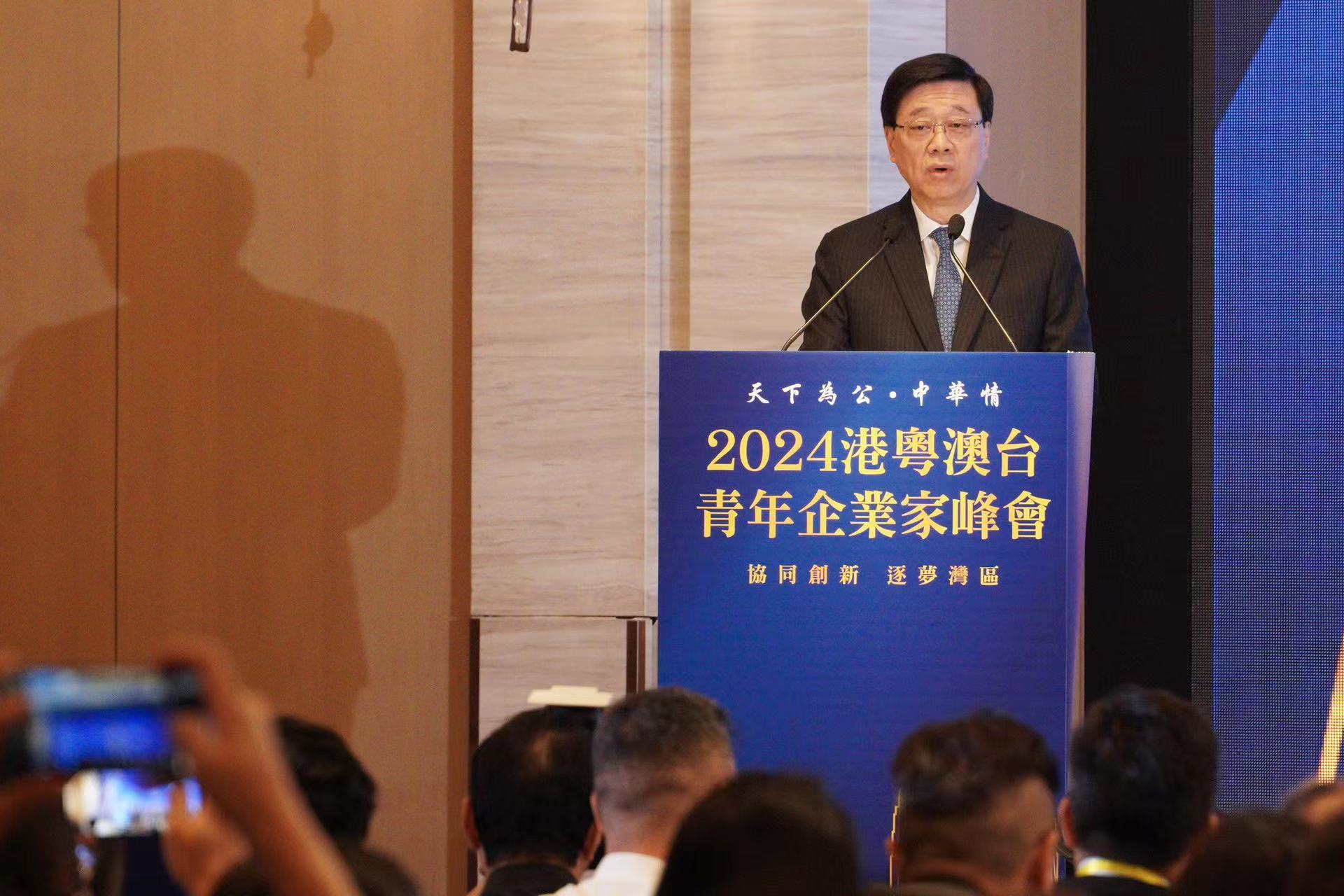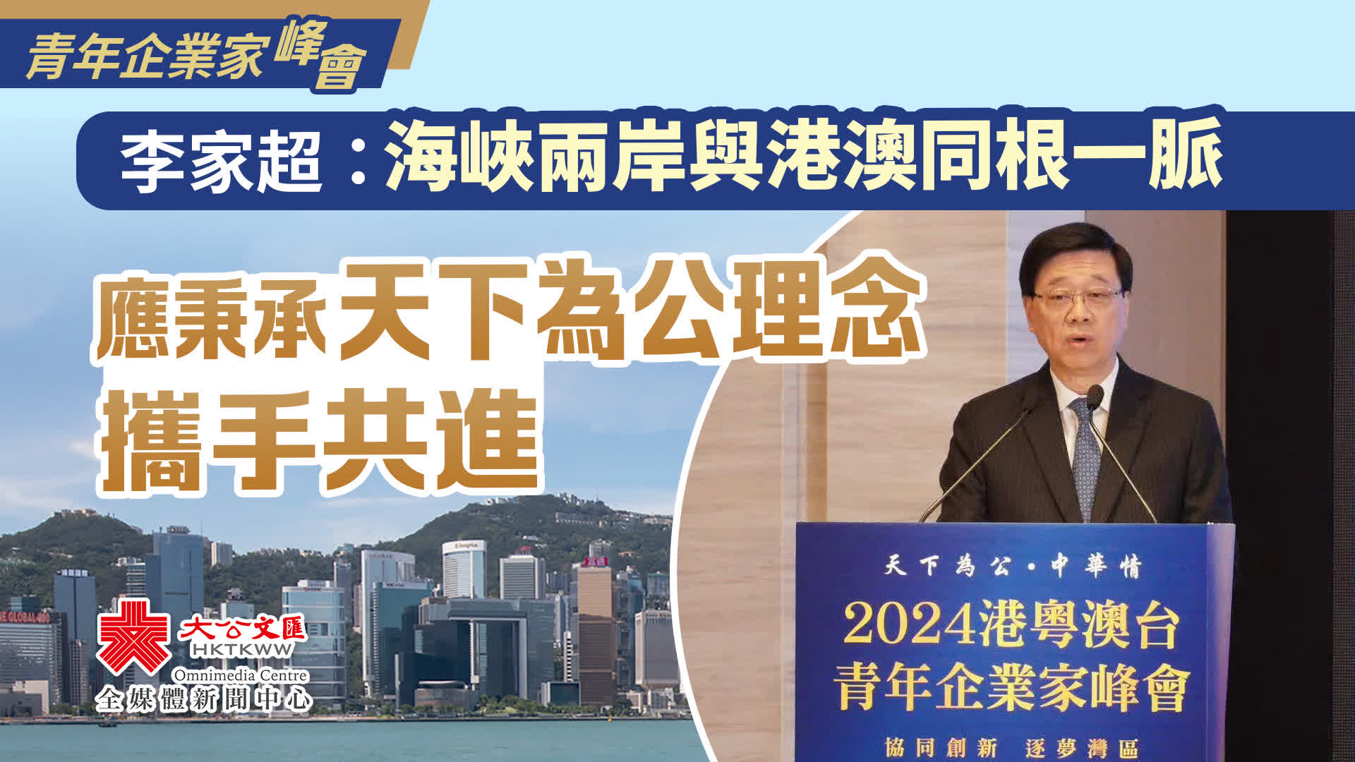 大公文匯全媒體報道,「『天下為公』·中華情」2024港粵澳台青年企業家峰會開幕式今日(10日)舉行。全國政協副主席梁振英、行政長官李家超、中央政府駐港聯絡辦主任鄭雁雄、外交部駐香港特別行政區特派員公署特派員崔建春等參與典禮。李家超在致辭時表示,海峽兩岸與香港澳門同根一脈血濃於水,精誠合作、共同成長是聚焦發展的必要之路。作為中華兒女的當代青年企業家,應秉承「天下為公」的理念,攜手共進。