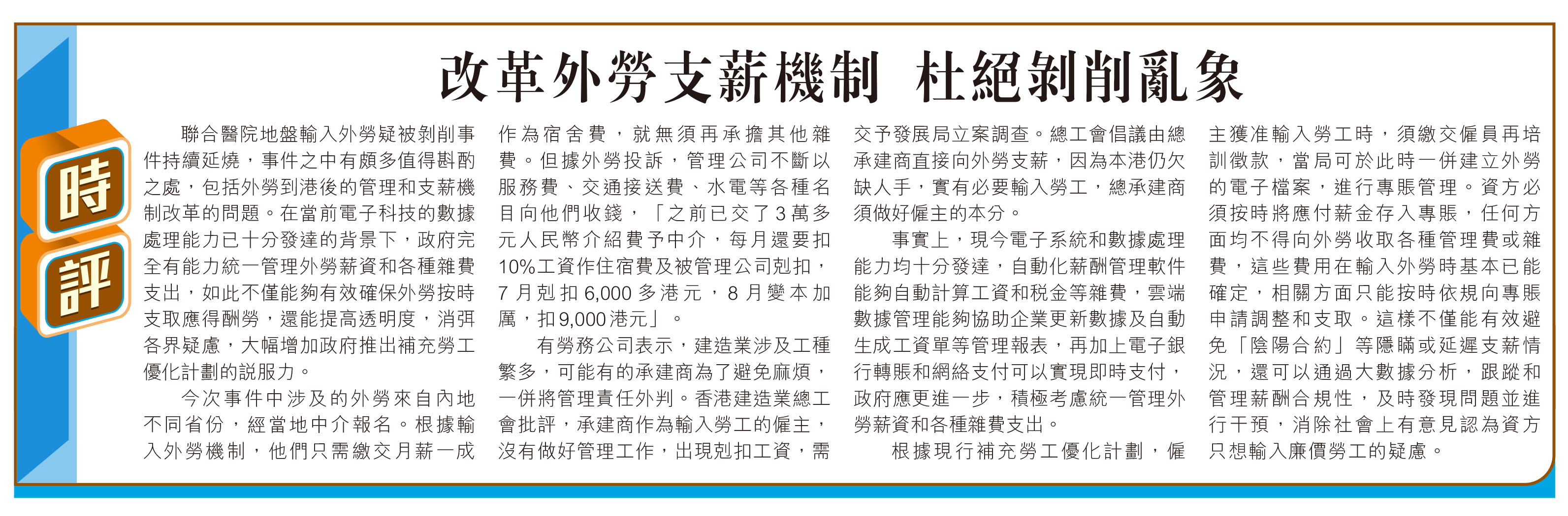 聯合醫院地盤輸入外勞疑被剝削事件持續延燒,事件之中有頗多值得斟酌之處,包括外勞到港後的管理和支薪機制改革的問題。在當前電子科技的數據處理能力已十分發達的背景下,政府完全有能力統一管理外勞薪資和各種雜費支出,如此不僅能夠有效確保外勞按時支取應得酬勞,還能提高透明度,消弭各界疑慮,大幅增加政府推出補充勞工優化計劃的說服力。