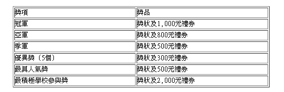 各比賽組別均設有冠、亞、季軍和5個優異獎,及最具人氣獎。評審團每組別會選出15件優秀作品,學生、家長及公眾人士可於10月29日至11月4日期間經投票網址選出最具人氣作品。每個組別的獎項和獎品如下: