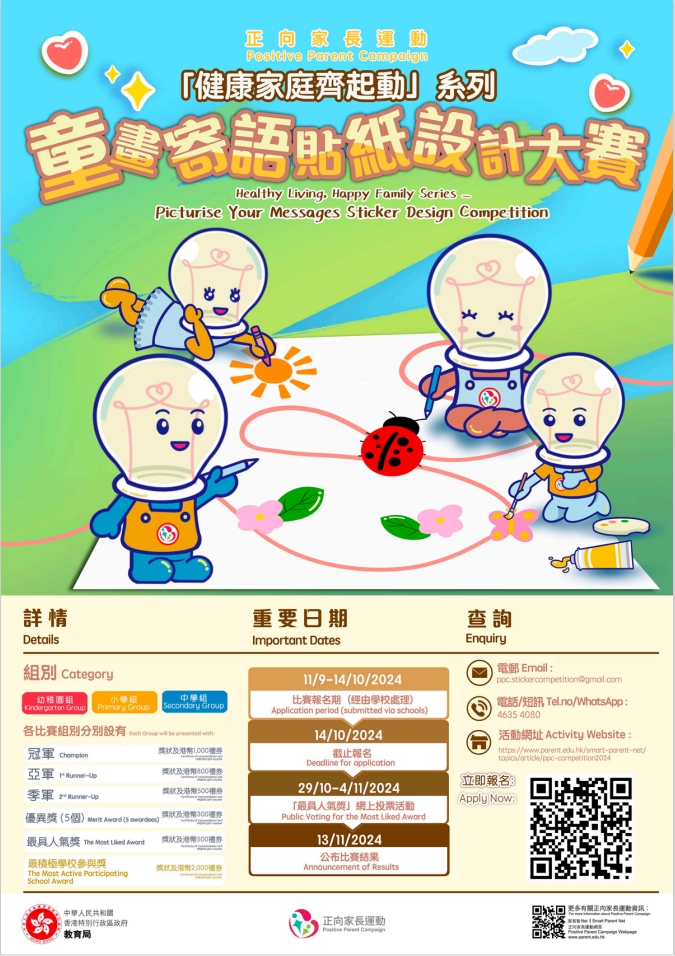 大公文匯全媒體報道,教育局今日(11日)邀請全港幼稚園、小學及中學鼓勵教師、學生和家長踴躍參加教育局舉辦的「健康家庭齊起動系列—童畫寄語貼紙設計大賽」。