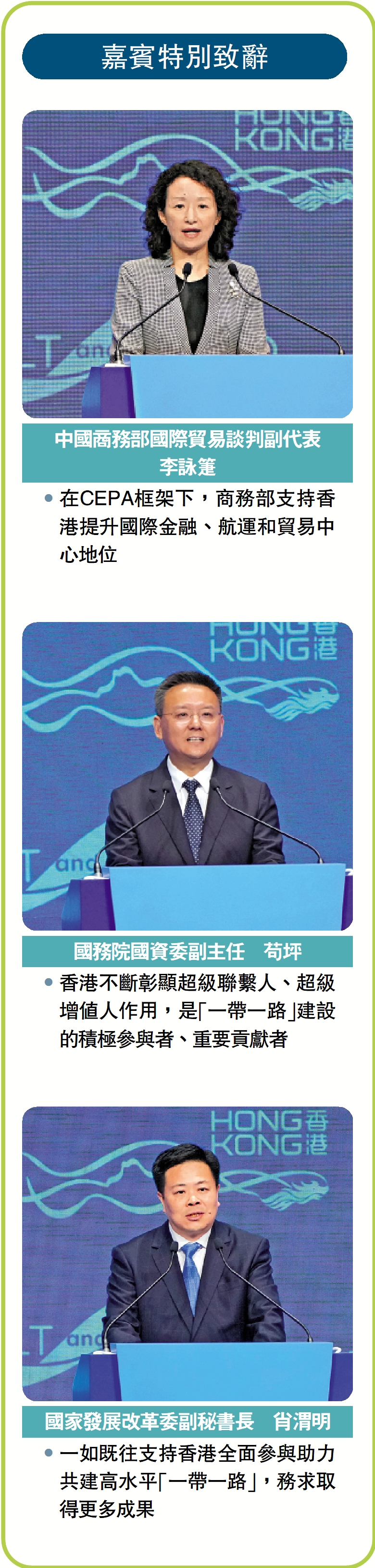 (大公報 記者 文梓、龔學鳴、林少權)第九屆「一帶一路高峰論壇」昨日在港舉辦,邀請了中國商務部國際貿易談判副代表李詠箑、國務院國有資產監督管理委員會副主任苟坪和國家發展與改革委員會副秘書長肖渭明發表特別致辭。