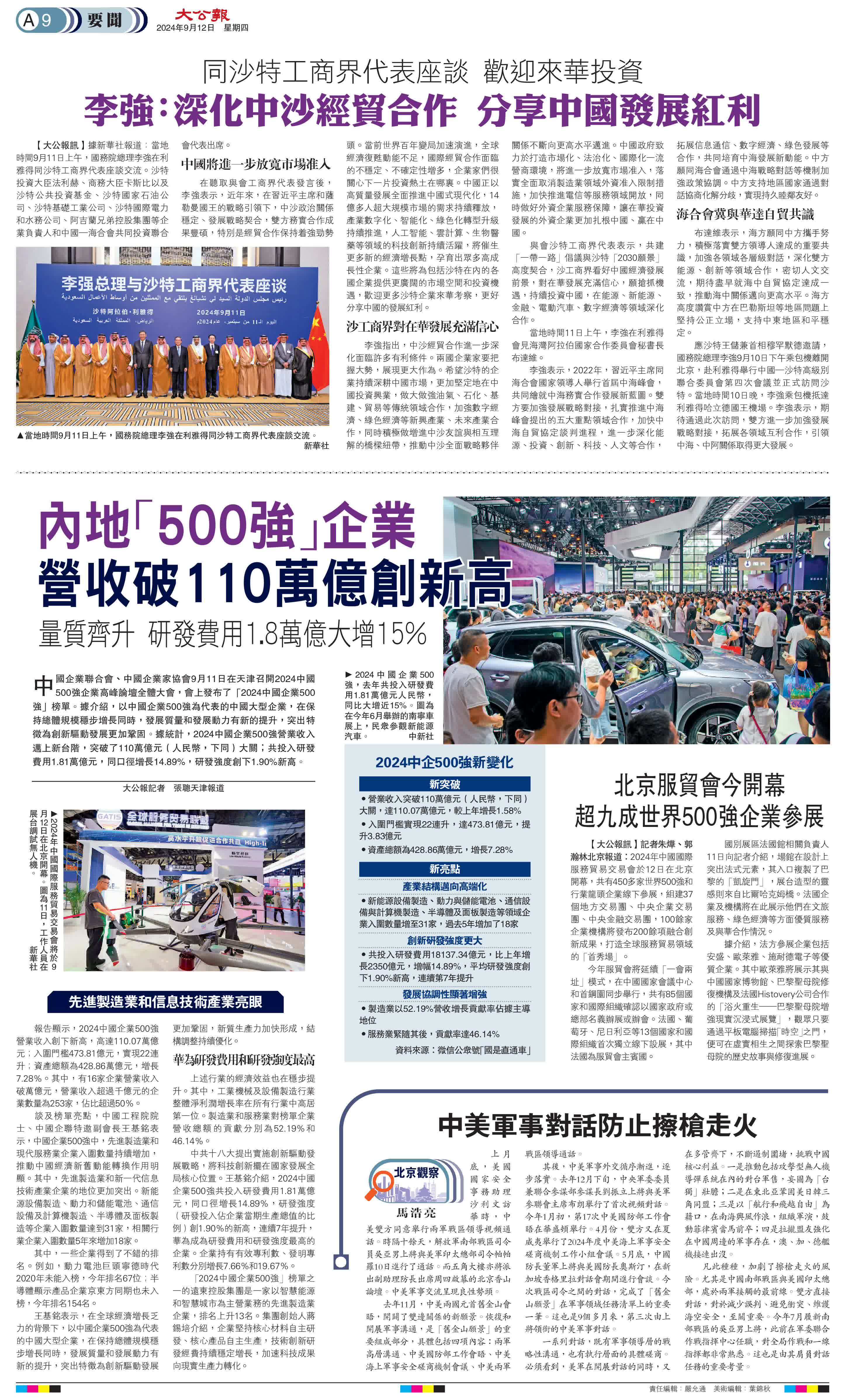 (大公報 記者 張聰 天津報道)中國企業聯合會、中國企業家協會9月11日在天津召開2024中國500強企業高峰論壇全體大會,會上發布了「2024中國企業500強」榜單。據介紹,以中國企業500強為代表的中國大型企業,在保持總體規模穩步增長同時,發展質量和發展動力有新的提升,突出特徵為創新驅動發展更加鞏固。據統計,2024中國企業500強營業收入邁上新台階,突破了110萬億元(人民幣,下同)大關;共投入研發費用1.81萬億元,同口徑增長14.89%,研發強度創下1.90%新高。