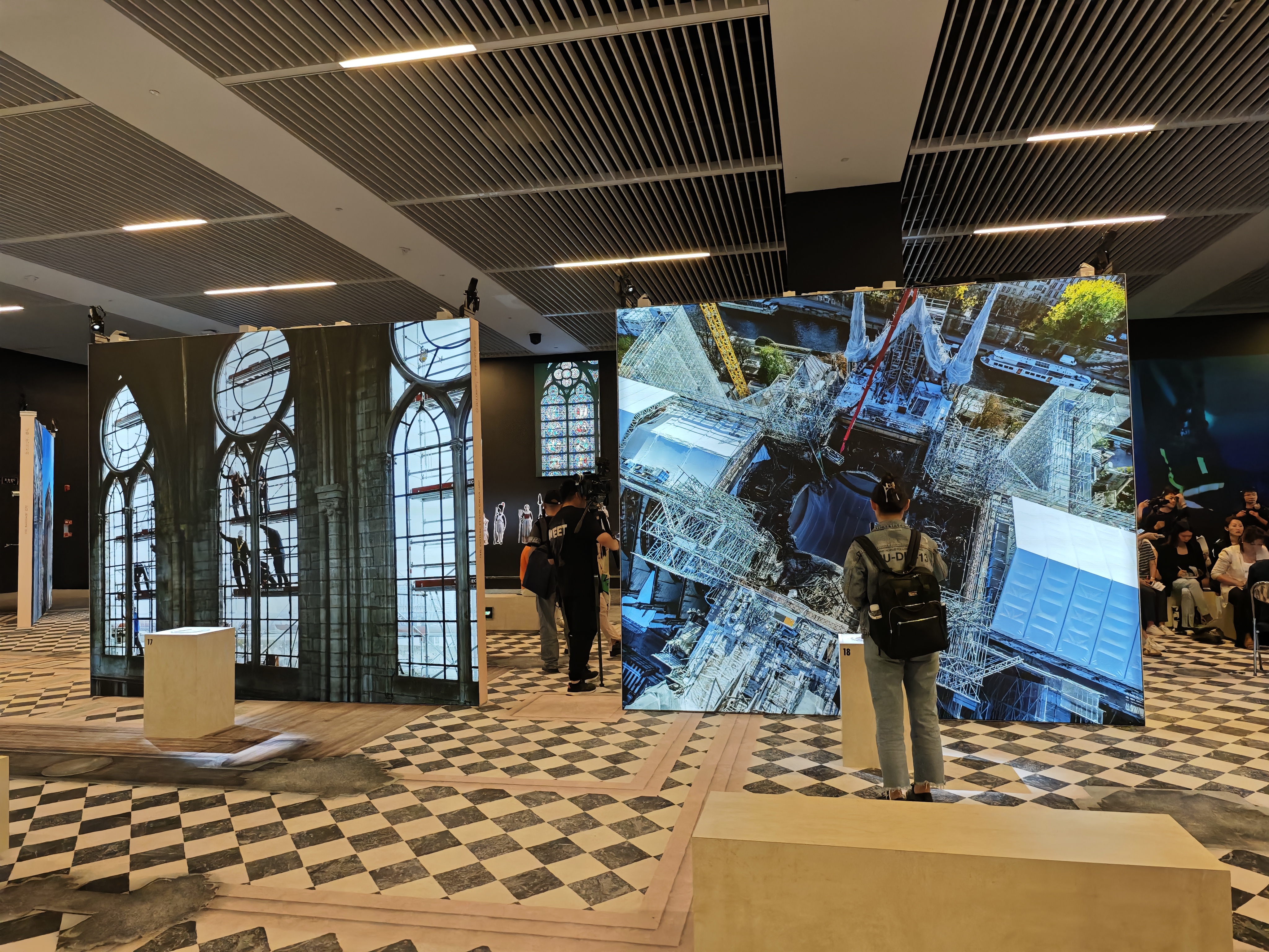 今次展覽藉助特製平板設備,以增強現實為主要展示手段,將實體與數字技術融合,從2019年聖母院的意外失火開始,回溯至1163年的遙遠歲月,以巴黎聖母院的重要歷史時刻為線索,展現其數百年的變遷與故事,同時見證修繕背後的精湛工藝。觀眾可通過設備與從事聖母院保護和修復工作的專家與工匠「面對面」。