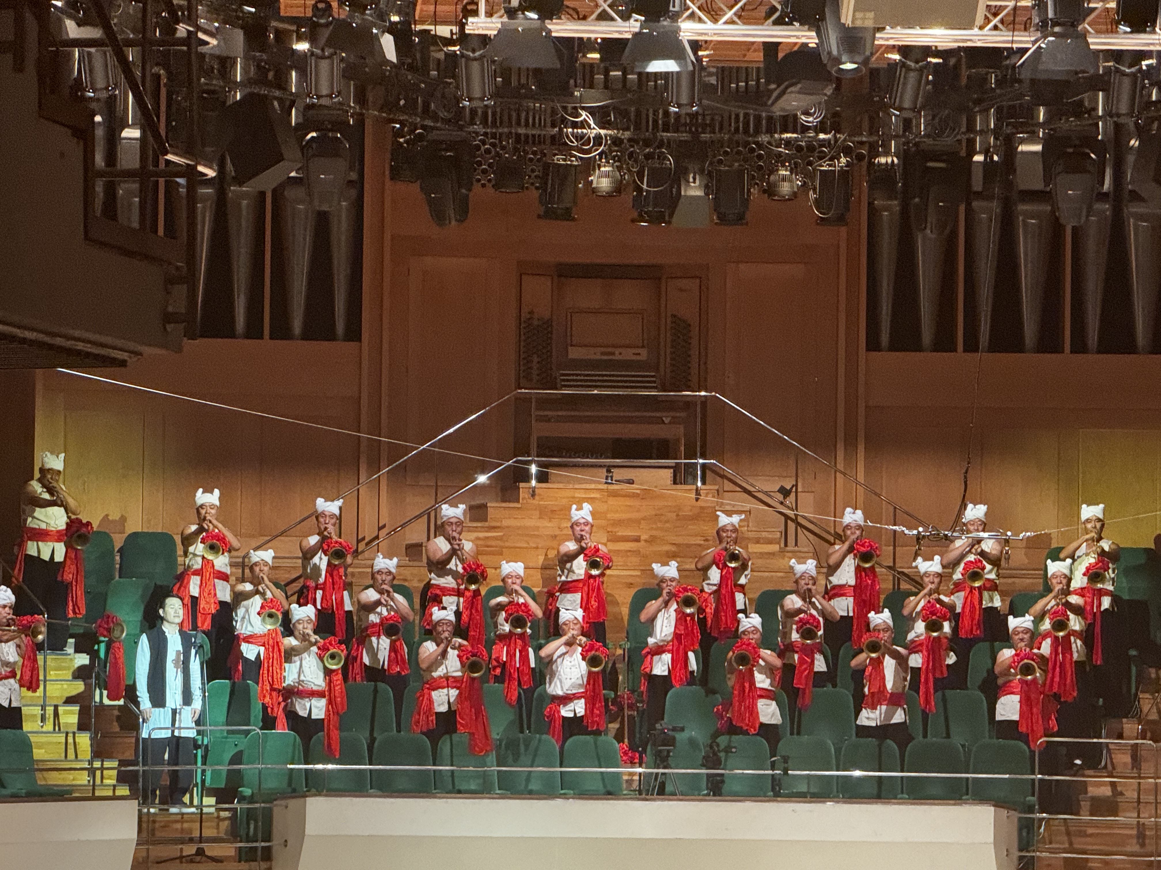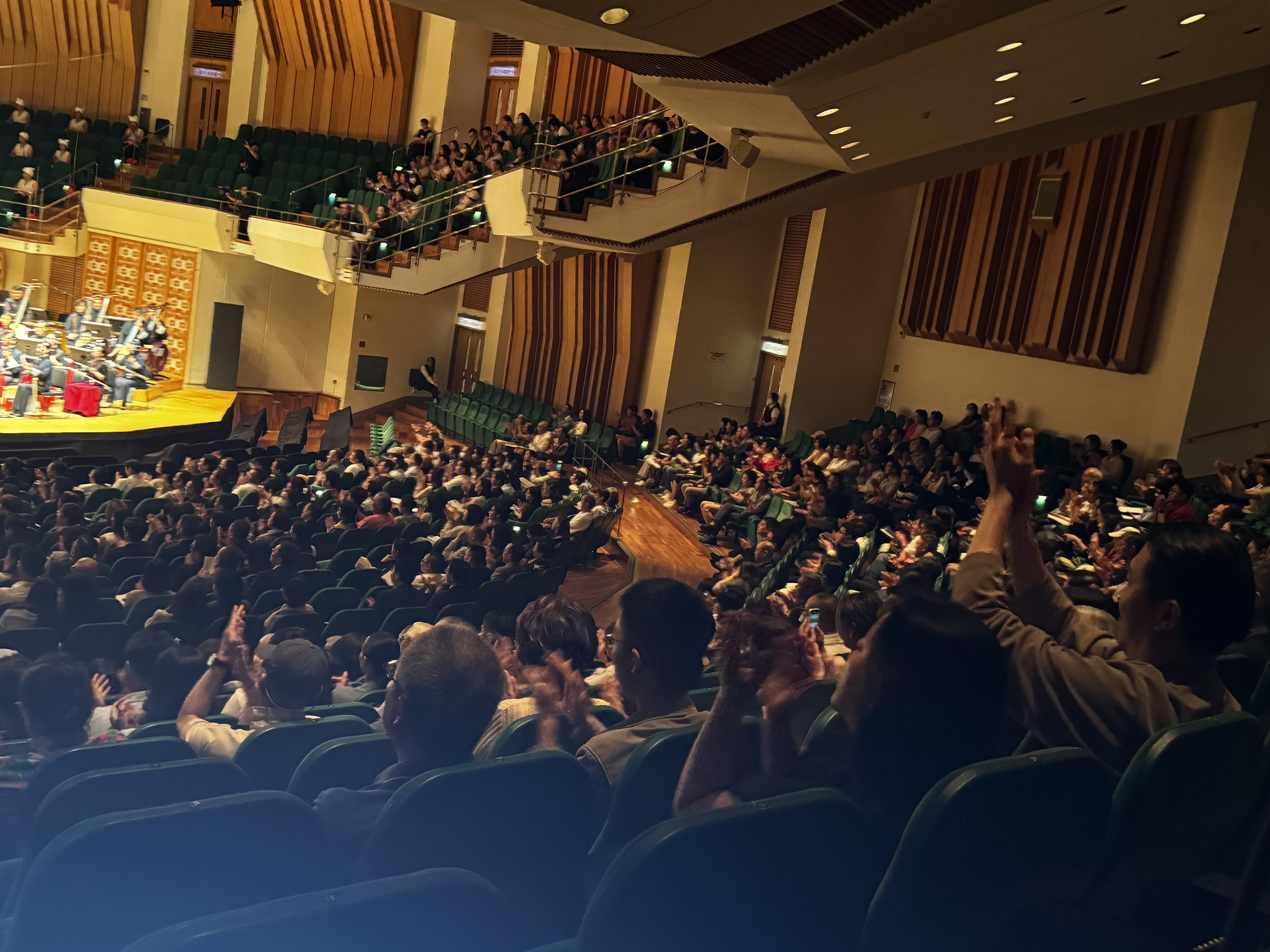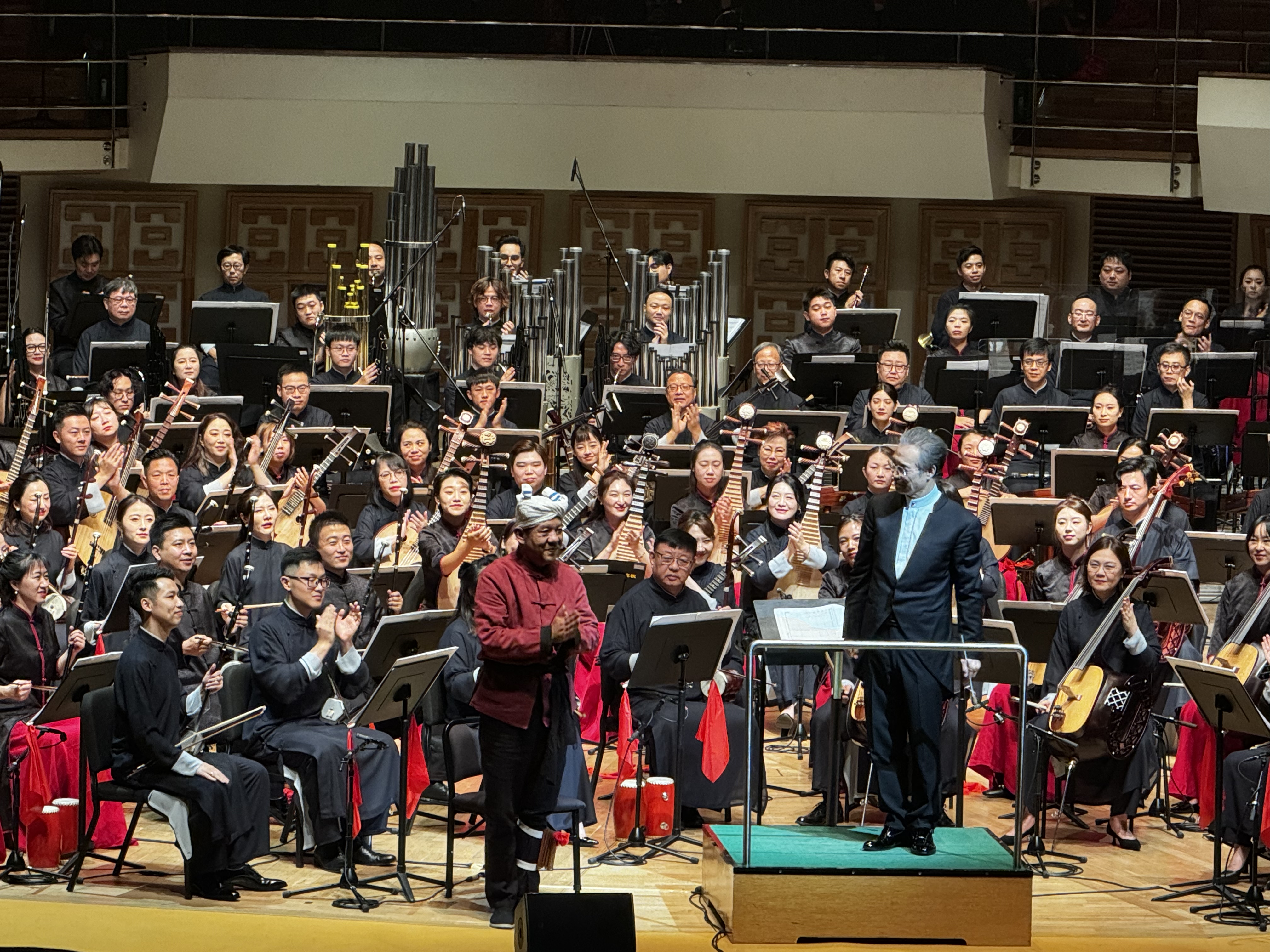 隨着最後一音的落幕,現場掌聲雷動,引得樂團返場,奏響《永遠的山丹丹》的背景旋律。最後,閻惠昌介紹在場的全體樂團,回應觀眾們的熱情,並介紹現場使用的環保胡琴。作曲家王丹紅亦走上台,和觀眾見面。