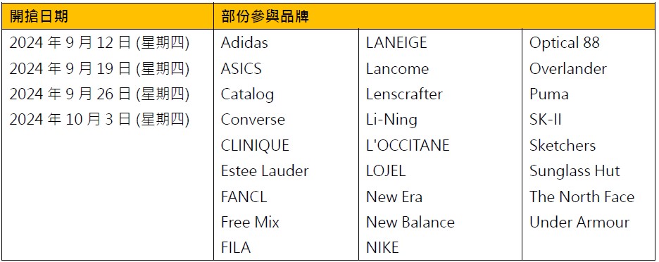德福廣場、青衣城、PopCorn、The LOHAS康城及圍方與超過200個商戶合作推出過萬張指定商戶優惠券,包括時尚服飾、美妝、家居用品、寵物用品、生活保健及環球餐飲等品牌。