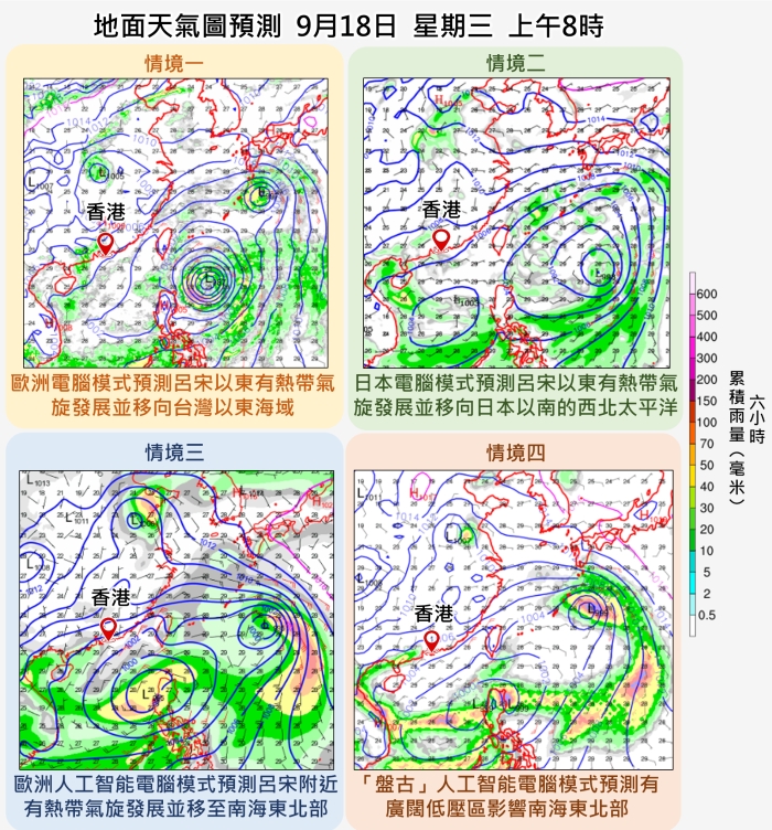 天文台上載4個電腦模式預報,其中3個分別來自歐洲及日本的電腦模式,均預測到熱帶氣旋發展,但移動方向各異;來自中國華為的「盤古」人工智能電腦模式則預測有廣闊低壓區影響南海東北部。