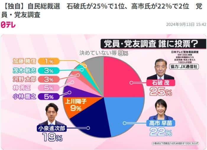 報道指出,雖然目前石破茂、高市早苗和小泉進次郎是熱門人選,但是由於自民黨的黨員、「黨友」和國會議員仍有多人未明確表態,選情仍有可能發生變化。