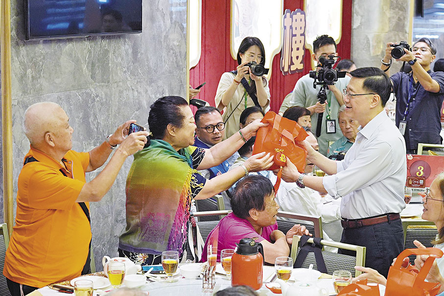 「見到你哋有笑容,就係我最大工作回報。」李家超到黃大仙一間酒樓與約百位長者及關愛隊成員在「賀國慶 迎中秋 關愛千歲團圓宴」上交流,一同慶祝國慶75周年及中秋節。他親手向長者送上由關愛隊等準備的福袋,裏面有月餅、麵食等,與長者一起提早過節。