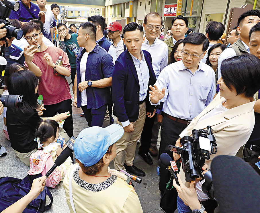 其間,李家超駐足與帶小朋友的市民交流,說:「見到你們生活得愉快,我就開心。」該名市民笑說:「很開心、很開心。」李家超又不忘囑咐小朋友要勤力讀書。
