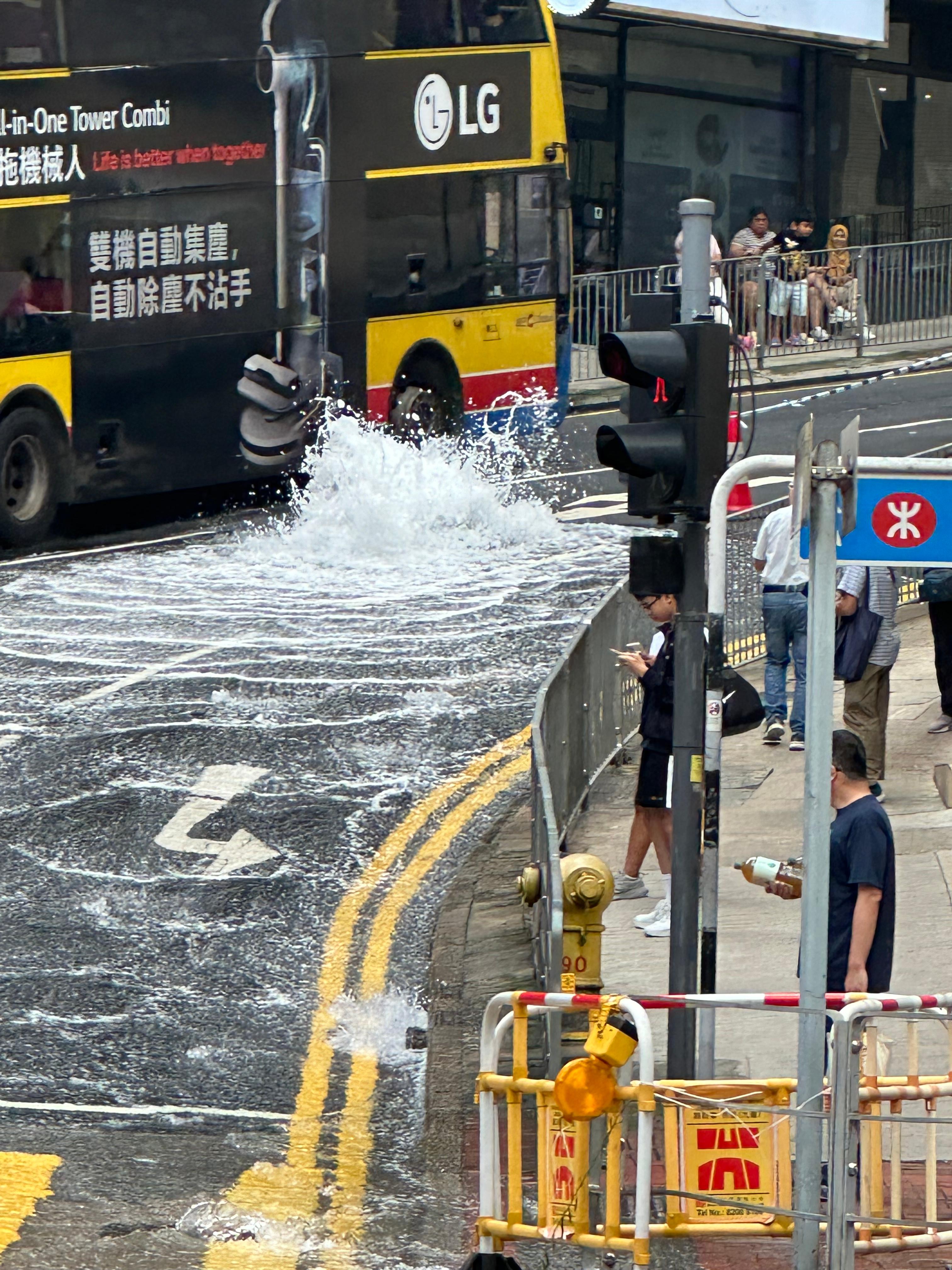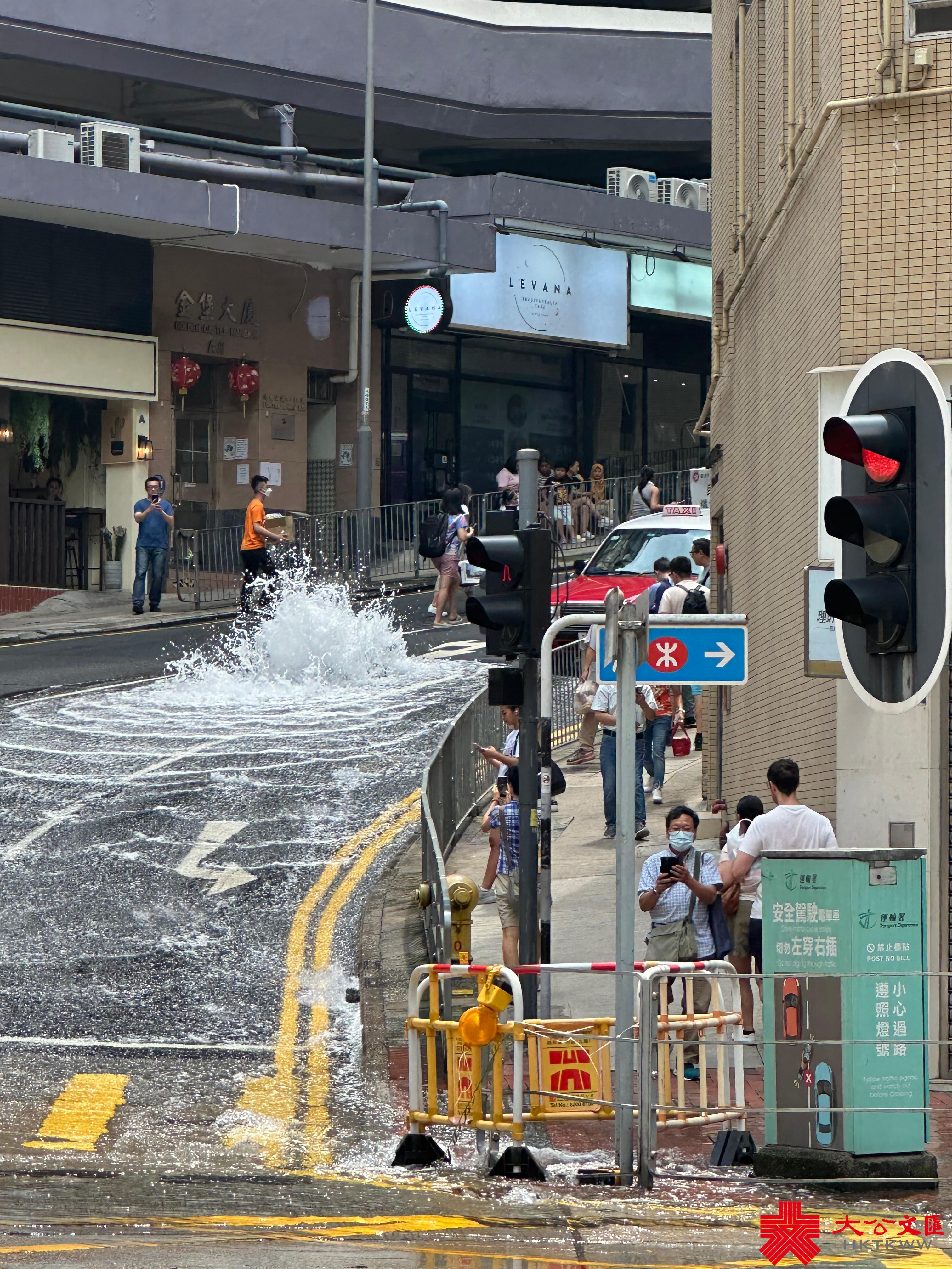 大公文匯全媒體報道,北角發生爆水管。事發今日(15日)上午9時許,北角炮台山道2號馬路位置有水管爆裂,噴出水柱最高達1.8米。大公文匯全媒體記者到現場可見,涉事路段斜路下方行人過路處水深近半呎,有想過馬路的市民見到此景只得「望洋興嘆」,也有不少人涉水而行。有警員在現場指揮交通,並協助清理路面磚石等。