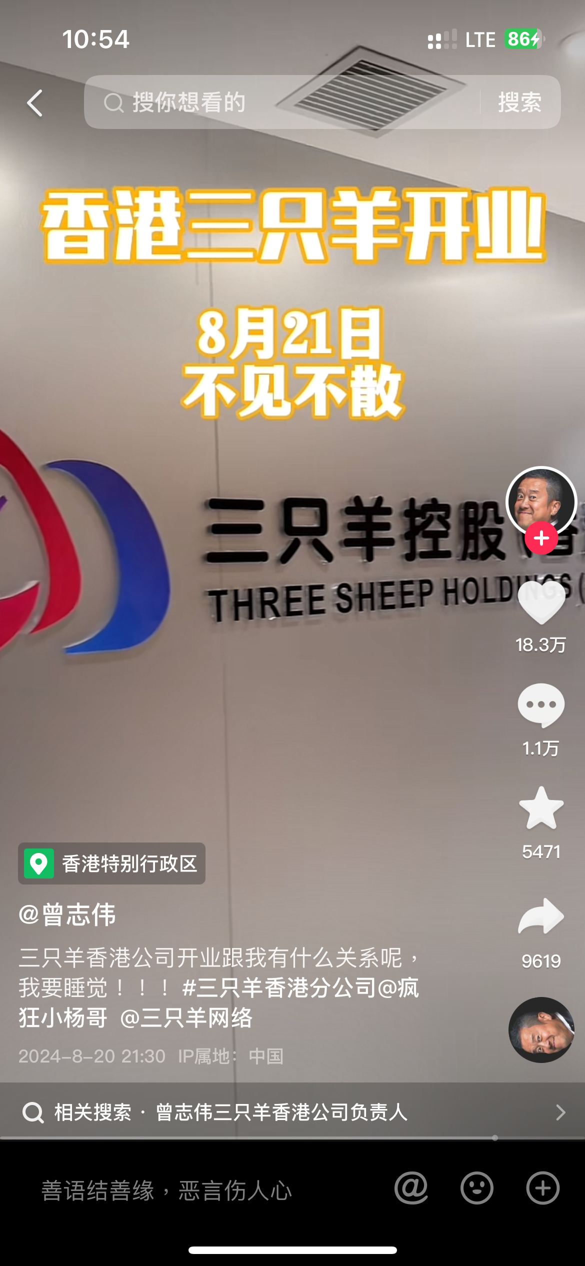 有網民扒出曾志偉曾現身三隻羊直播間為「美誠月餅」站台,更被發現其疑似是「三隻羊」香港分公司董事長。在8月21日,三隻羊控股(香港)有限公司正式開業。開業現場,曾志偉、譚詠麟、鍾鎮濤等藝人出席晚宴。內地直播網紅「瘋狂小楊哥」此前曾公開表示,曾志偉是三隻羊香港分公司老闆。