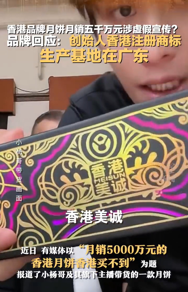 大公文匯全媒體報道,內地「三隻羊」集團旗下各大主播前不久帶貨的一款「美誠月餅」近日引起外界關注,因在直播帶貨過程中,主播在介紹這款月餅時着重強調「香港」字眼,但有內地媒體從生產企業方證實該款月餅產自廣東,且目前在香港沒有銷售,質疑是「假香港品牌」。