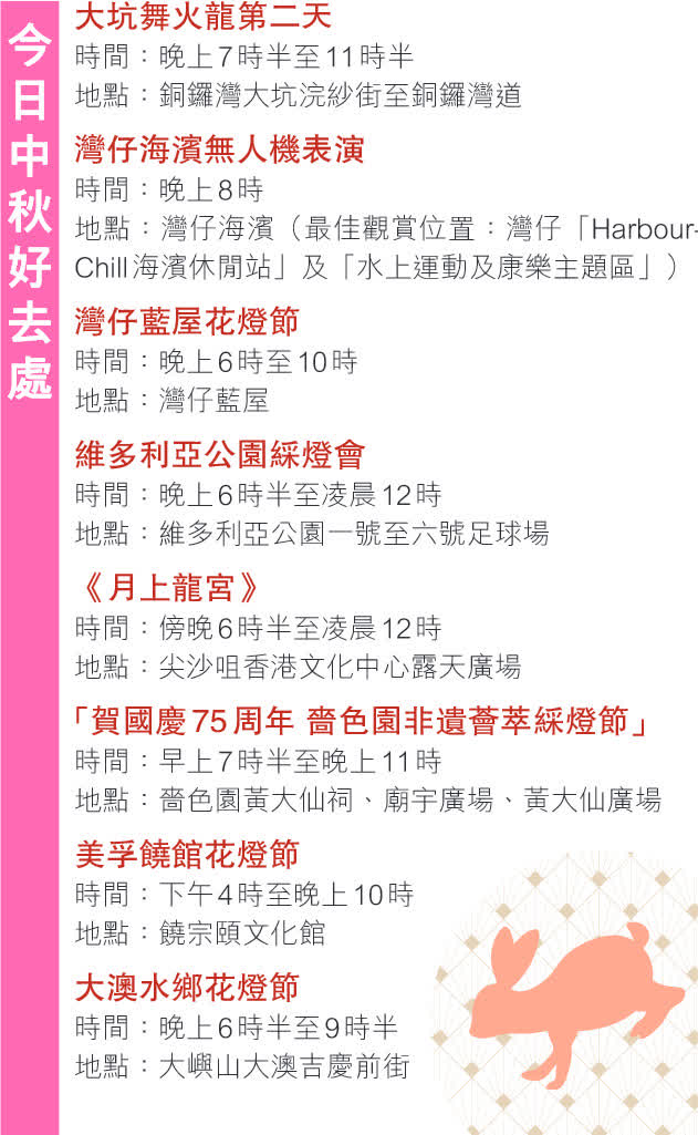 另外,旅發局今晚8時亦於灣仔海濱舉行中秋節主題的無人機表演,共1,000架無人機組成玉兔和月餅等不同圖案,更會有空中火舞巨龍表演。