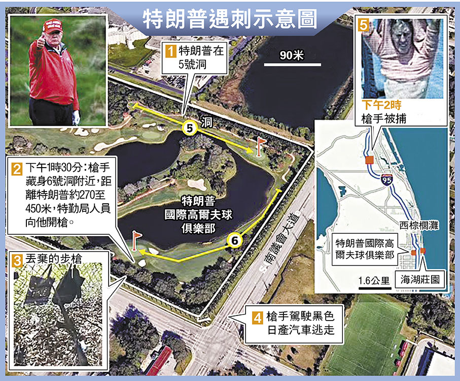 香港文匯報報道,美國共和黨總統候選人特朗普7月在賓夕法尼亞州造勢集會上被槍擊受傷,事隔僅兩個月後再度遇刺。他於剛過去的周日(9月15日)在其名下位於佛羅里達州西棕櫚灘的特朗普國際高爾夫球俱樂部打球時,特勤局人員發現有人在場外擎槍,隨即向其開火,槍手立即開車逃走,其後被捕。當局將事件列為「企圖暗殺」,正調查槍手犯案動機。槍手周一在佛州西棕櫚灘聯邦法院提堂,被控兩項與槍支有關罪名。