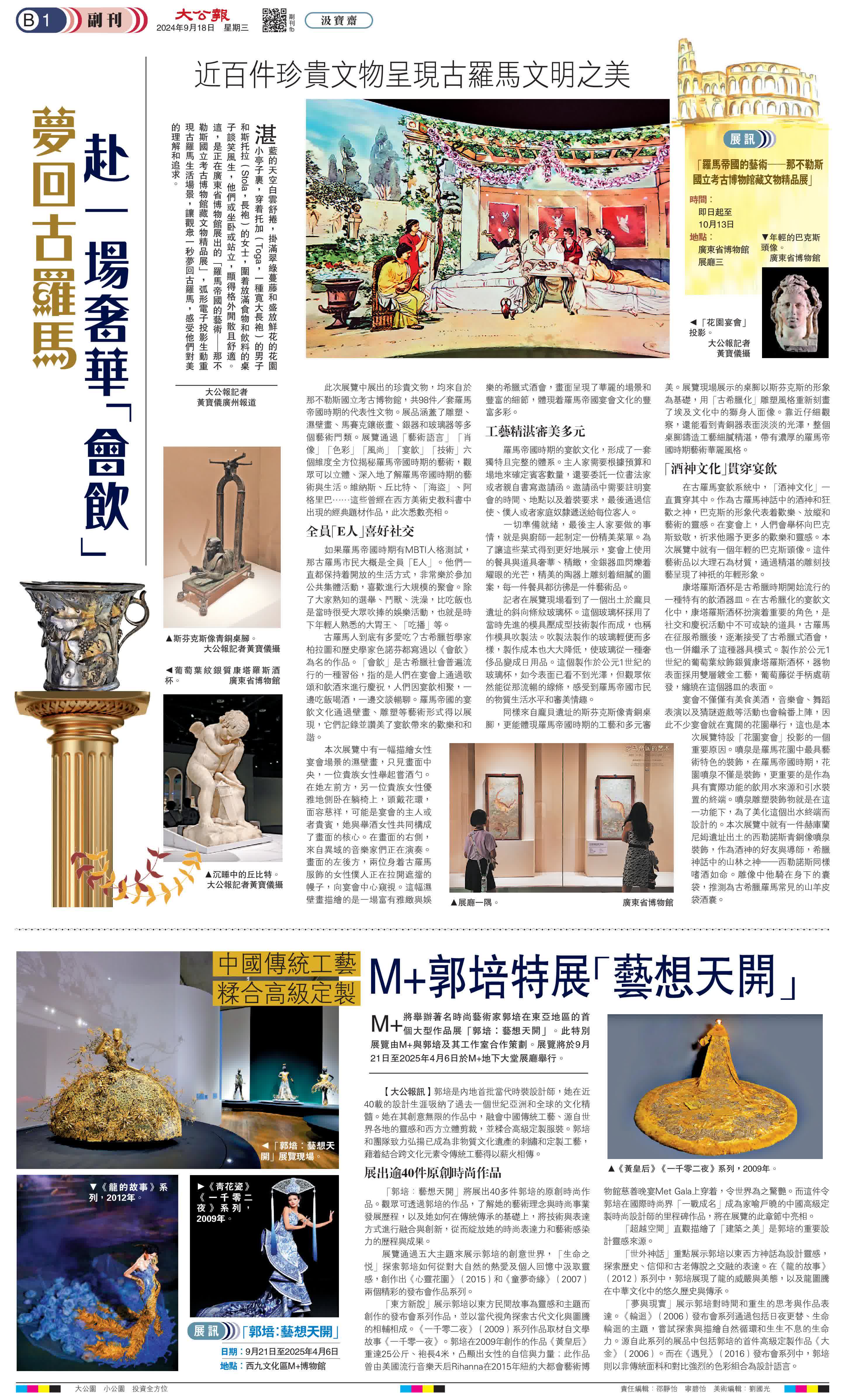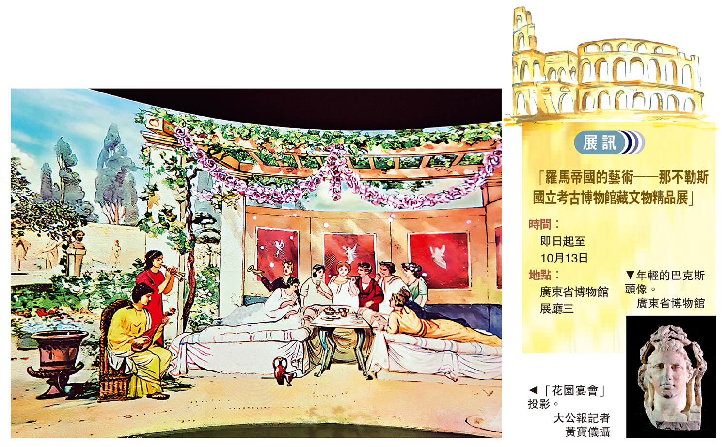 (大公報記者 黃寶儀廣州報道)湛藍的天空白雲舒捲,掛滿翠綠蔓藤和盛放鮮花的花園小亭子裏,穿着托加(Toga,一種寬大長袍)的男子和斯托拉(Stola,長袍)的女士,圍着放滿食物和飲料的桌子談笑風生,他們或坐卧或站立,顯得格外閒散且舒適。這,是正在廣東省博物館展出的「羅馬帝國的藝術││那不勒斯國立考古博物館藏文物精品展」,弧形電子投影生動重現古羅馬生活場景,讓觀眾一秒夢回古羅馬,感受他們對美的理解和追求。