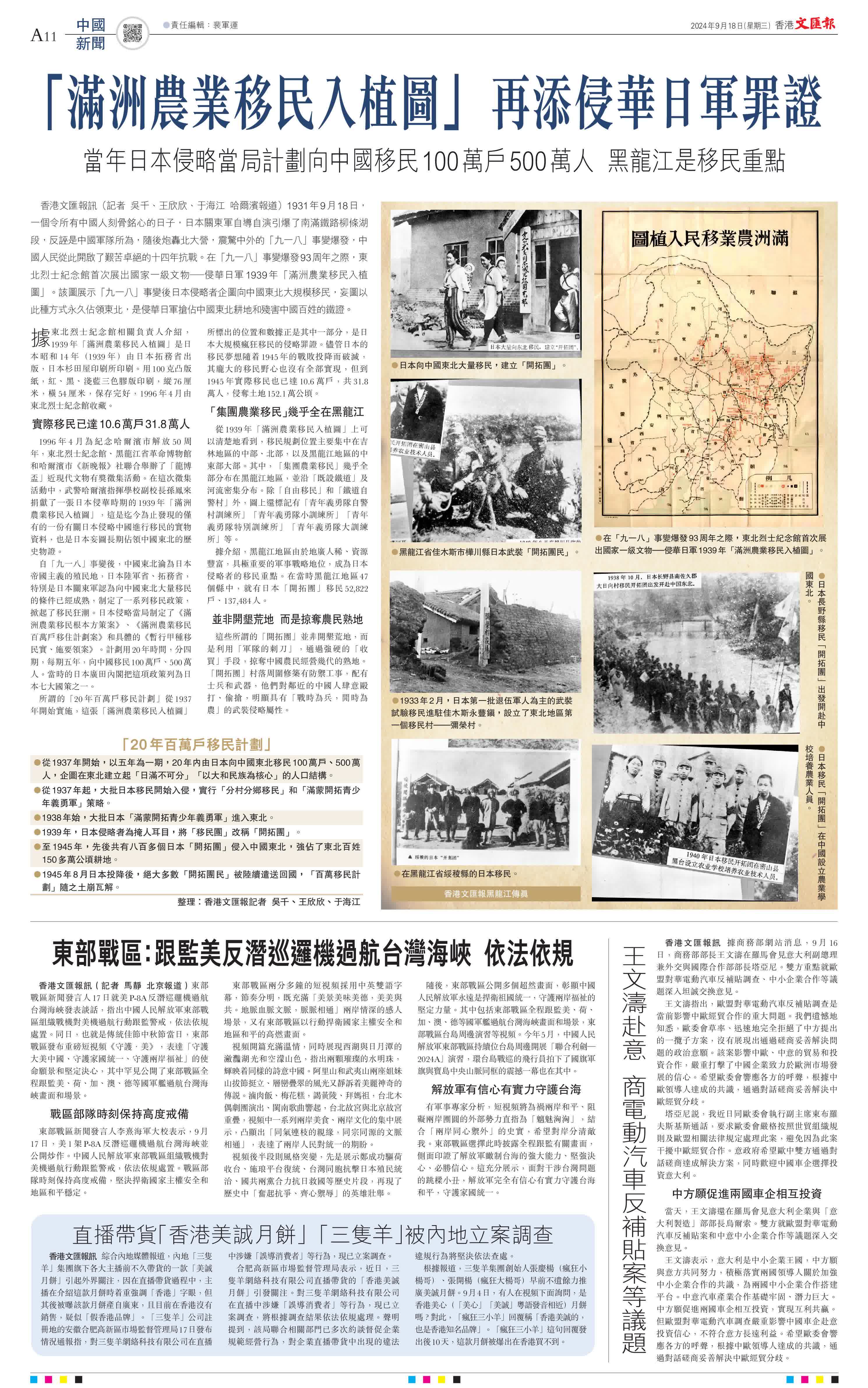 (香港文匯報訊記者 吳千、王欣欣、于海江 哈爾濱報道)1931年9月18日,一個令所有中國人刻骨銘心的日子,日本關東軍自導自演引爆了南滿鐵路柳條湖段,反誣是中國軍隊所為,隨後炮轟北大營,震驚中外的「九一八」事變爆發,中國人民從此開啟了艱苦卓絕的十四年抗戰。在「九一八」事變爆發93周年之際,東北烈士紀念館首次展出國家一級文物—侵華日軍1939年「滿洲農業移民入植圖」。該圖展示「九一八」事變後日本侵略者企圖向中國東北大規模移民,妄圖以此種方式永久佔領東北,是侵華日軍搶佔中國東北耕地和殘害中國百姓的鐵證。