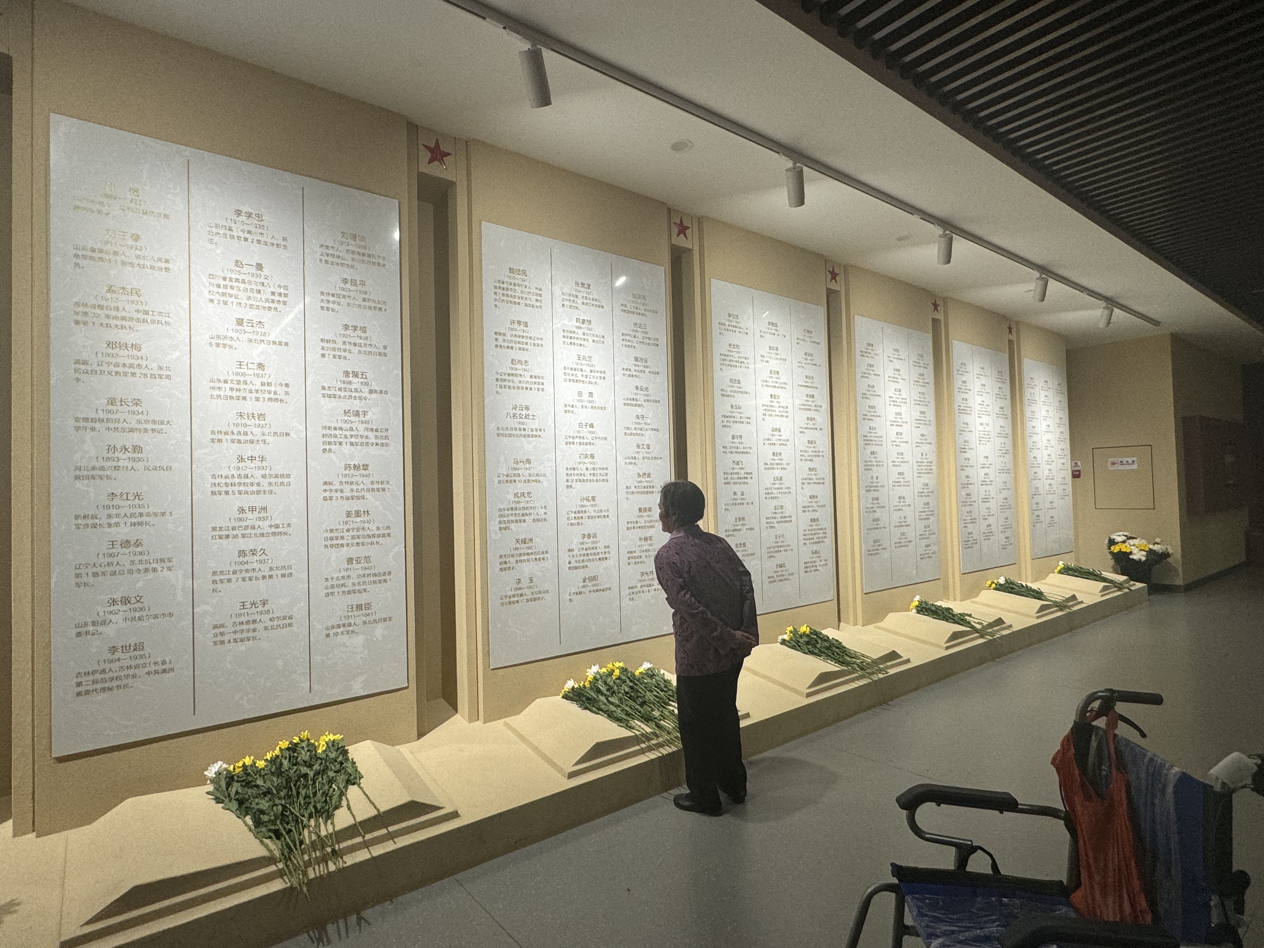 尤為感人的是,「東北抗戰英烈和英雄群體紀念牆」前也匯聚了大量自發而來的群眾,大家通過敬獻鮮花的方式,共同向抗戰英烈致以崇高的敬意與深切的緬懷。在現場,一位年邁的老人顯得格外引人注目,她靜靜地站立在紀念牆前,目光溫柔而堅定地掠過每一個刻滿英雄姓名的碑面,淚光閃爍,輕撫眼角。通過老人家人介紹,這位老人已85歲高齡,她見證了長春淪陷的屈辱與悲憤,每年數次前來緬懷,用行動詮釋着歷史的記憶與傳承。
