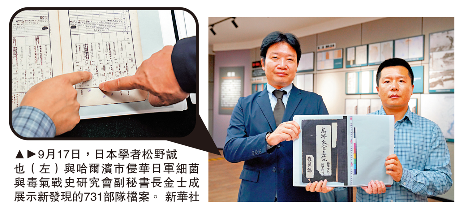 大公報據新華社報道:九一八事變爆發93周年之際,為聯合開展日本細菌戰研究,日本學者、黑龍江外國語學院特聘教授松野誠也向侵華日軍第七三一部隊罪證陳列館披露一份731部隊新檔案,名為《陸軍高等文官名簿 陸軍書記官 陸軍技師》。據介紹,此前公布的731部隊留守名簿記載了50名「惡魔技師」,這份檔案又發現了7名731部隊技師,更加清晰地呈現731部隊的總體形制與人員構成。專家表示,這是中日聯合揭露日本細菌戰罪行的一次嘗試,此次公布的檔案對於全面揭示日本細菌戰罪行具有重要意義。未來,可以團結更多和平力量,共同揭露日本細菌戰暴行。