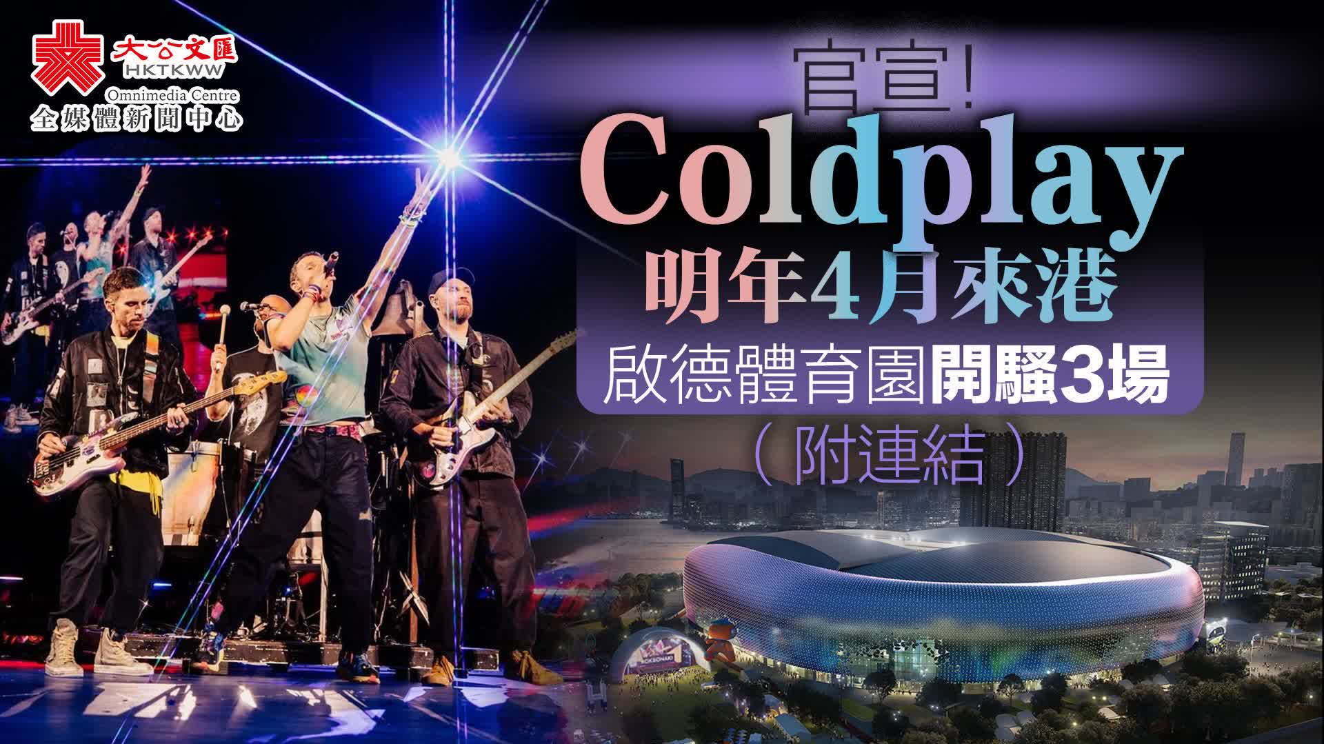 大公文匯全媒體報道,啟德體育園將於明年首季開幕,英國搖滾樂隊Coldplay今日(19日)宣布,將於明年4月9、11及12日在啟德體育園舉辦演唱會。