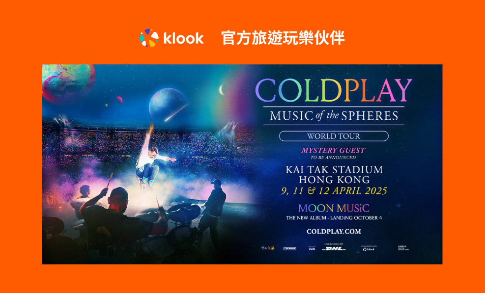 另外,旅遊平台Klook宣布成為「Coldplay: Music Of The Spheres World Tour」官方旅遊玩樂夥伴,帶來獨家演唱會優先預訂,推出包括演唱會門票及一晚或兩晚酒店住宿的體驗套票。套票將於2024年10月8日早上10時起於Klook平台上獨家預售。套票內容包括演唱會門票及一晚或兩晚的香港酒店住宿。(Klook體驗套票詳情)