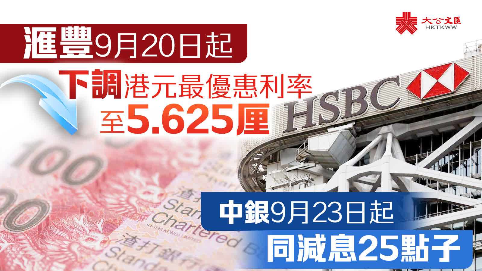 滙豐銀行宣布,自2024年9月23日(星期一)起,該行港元最優惠利率由年利率5.875%調低至5.625%。