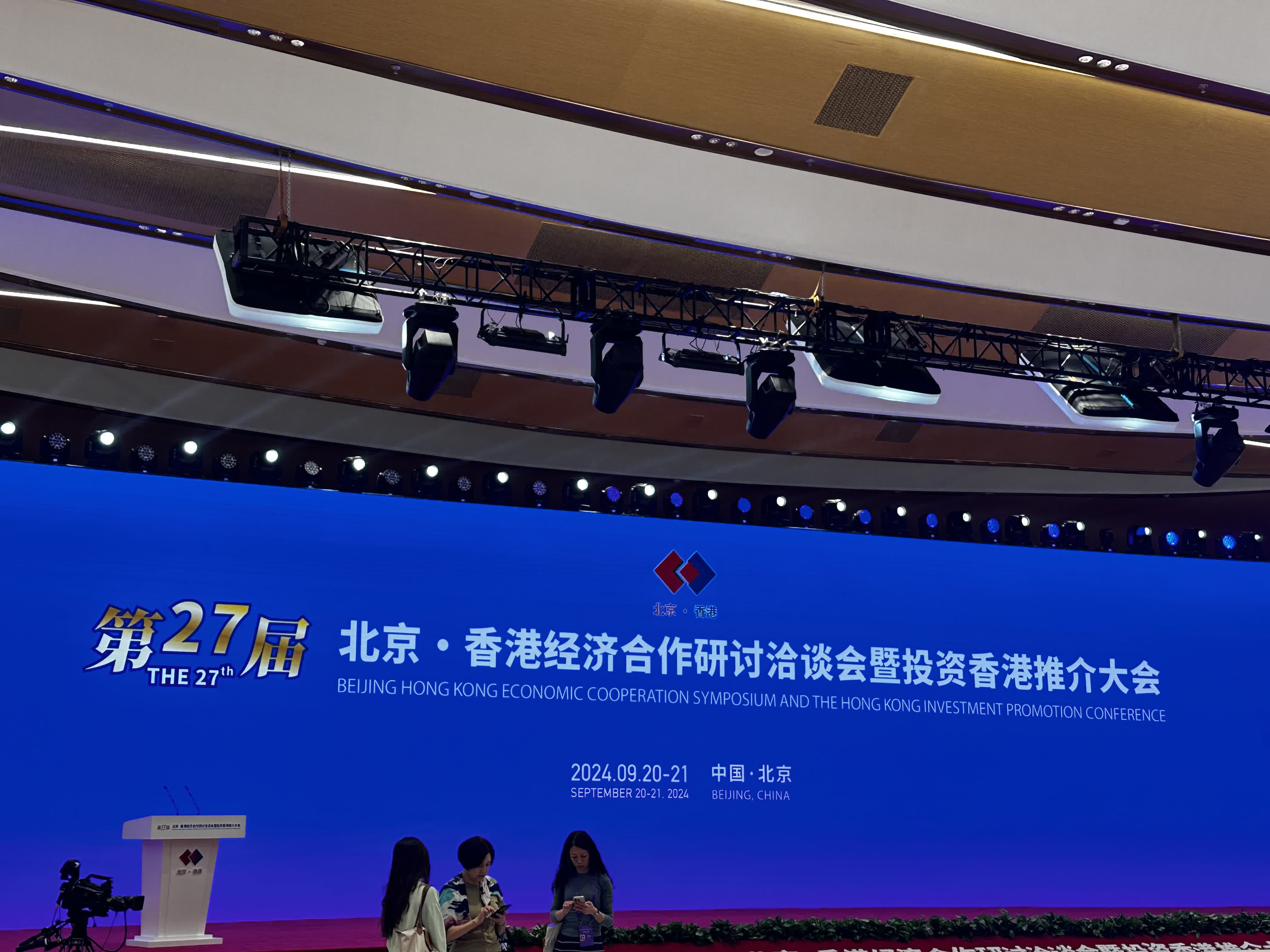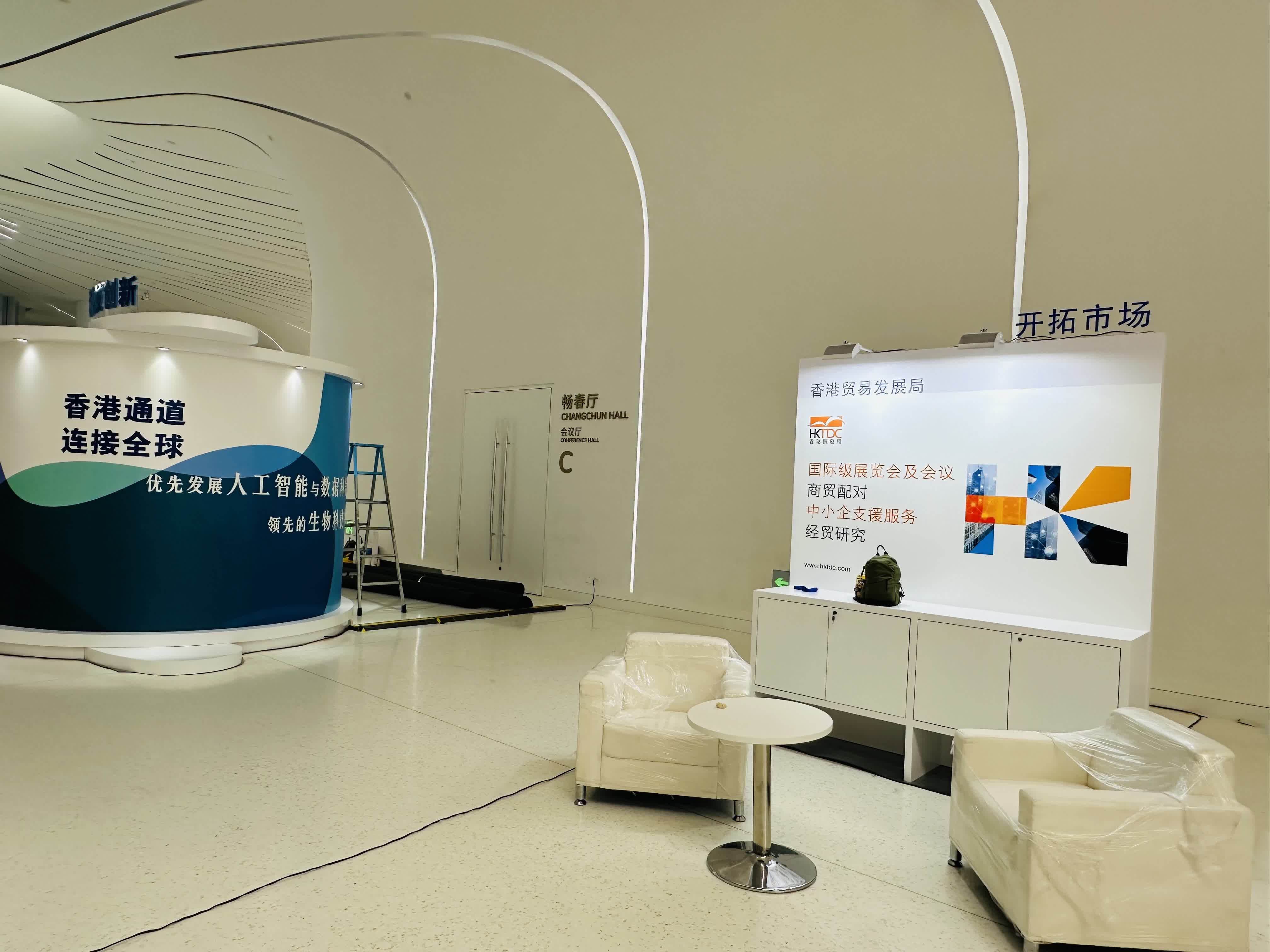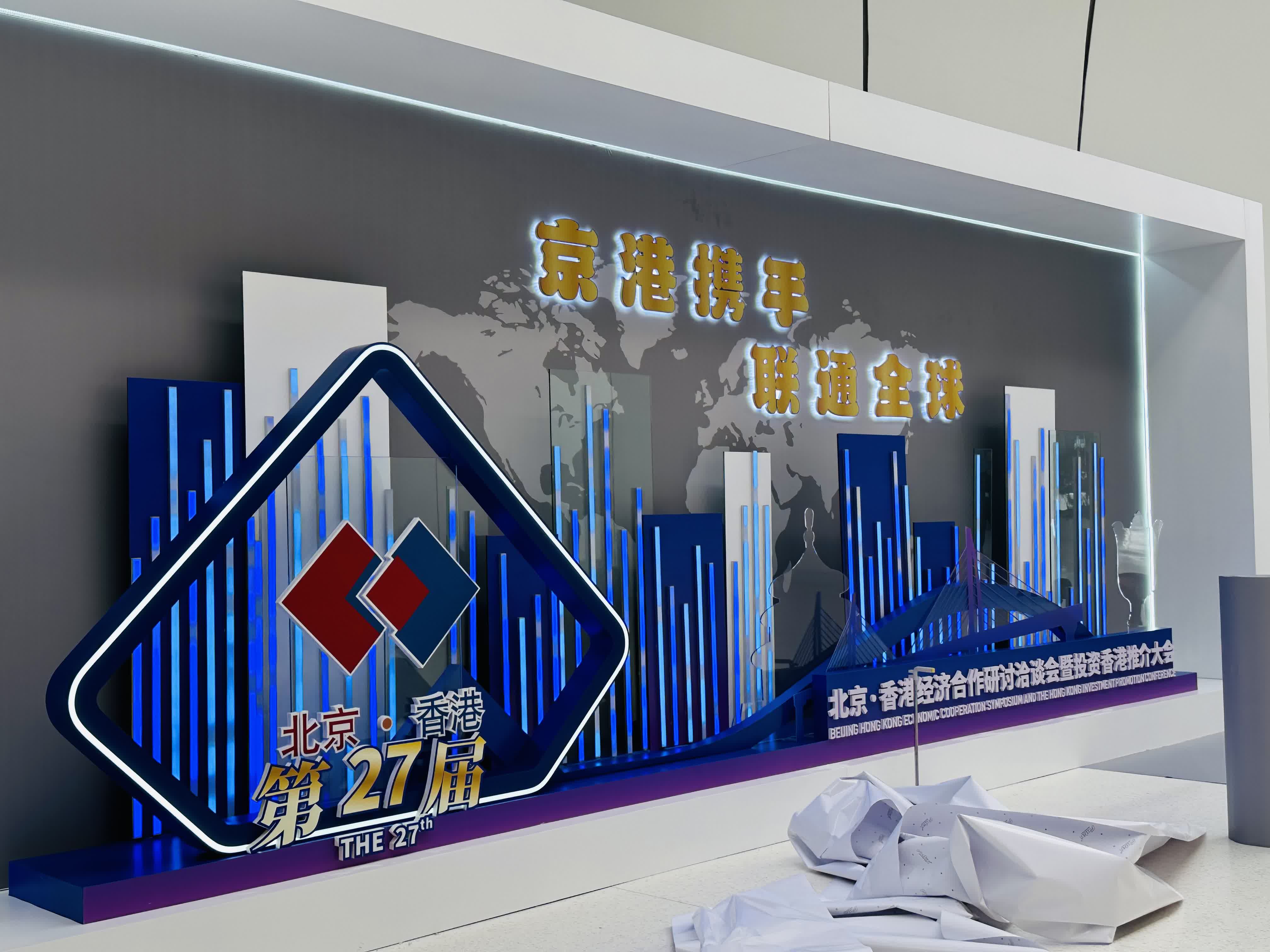 (大公文匯網記者 蘇雨潤 北京報道)第二十七屆京港洽談會暨投資香港推介大會將於明日(20日)在北京中關村國際創新中心開幕。記者今日(19日)下午專程前往主會場中關村國際創新中心提前探館,來到會場第一感覺就是場館科技感十足,展覽區和會場都已準備就緒,工人們正在做着最後的收尾工作,會場上「京港攜手,聯通全球」的標語格外醒目。香港貿易發展局在會場設立「香港通道 連接全球」展示區和諮詢台也已搭建完畢。