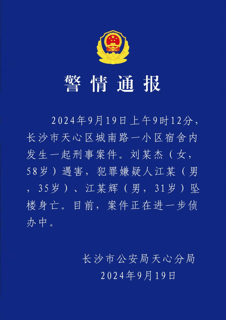 大公文匯網報道,湖南省長沙市公安局天心分局發布警情通報,2024年9月19日上午9時12分長沙市天心區城南路一小區宿舍內發生一起刑事案件。劉某傑(女,58歲)遇害,犯罪嫌疑人江某(男35歲)、江某輝(男,31歲)墜樓身亡。目前,案件正在進一步偵辦中。