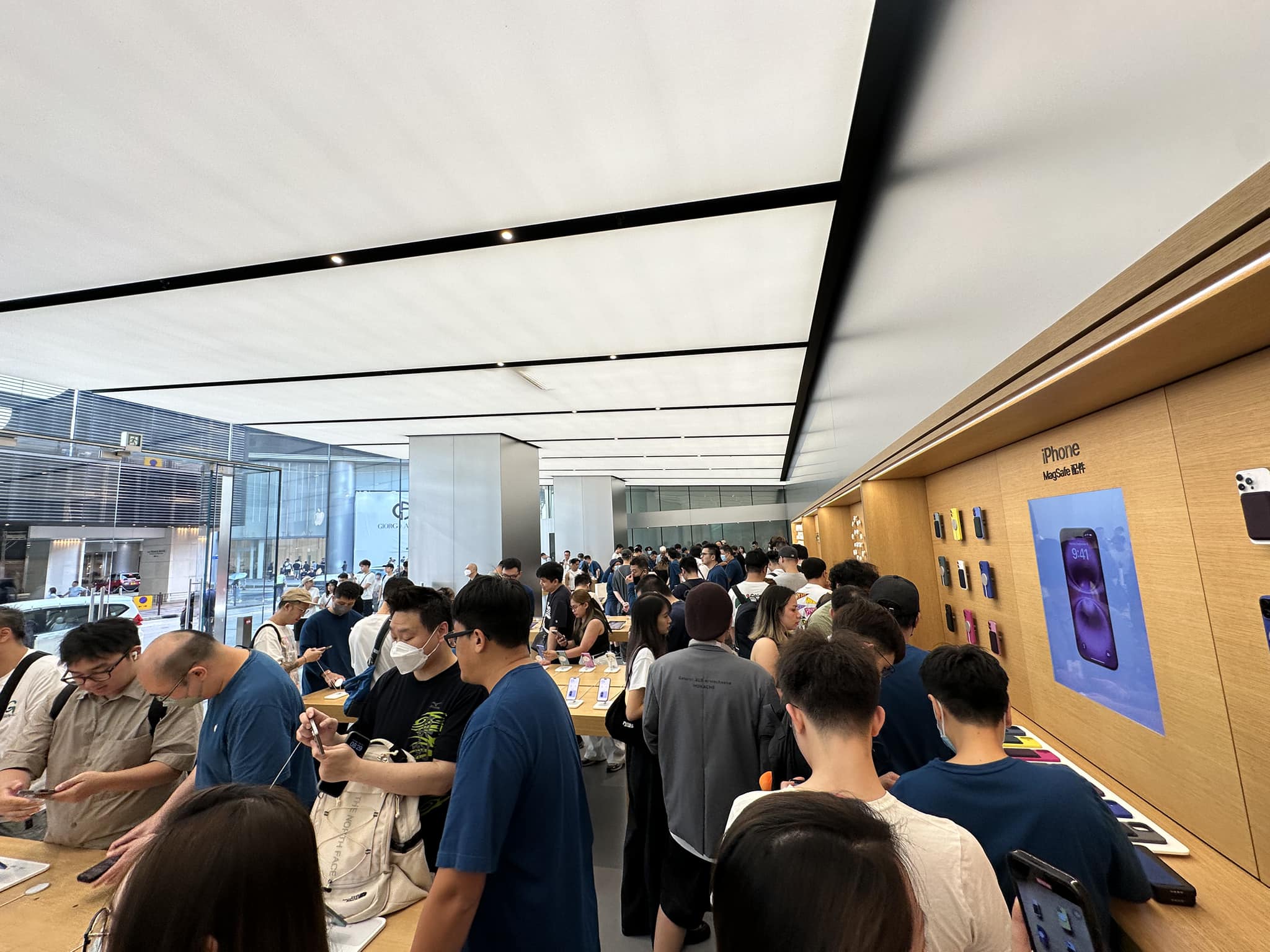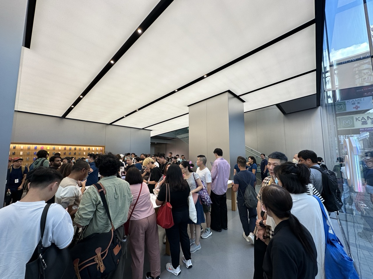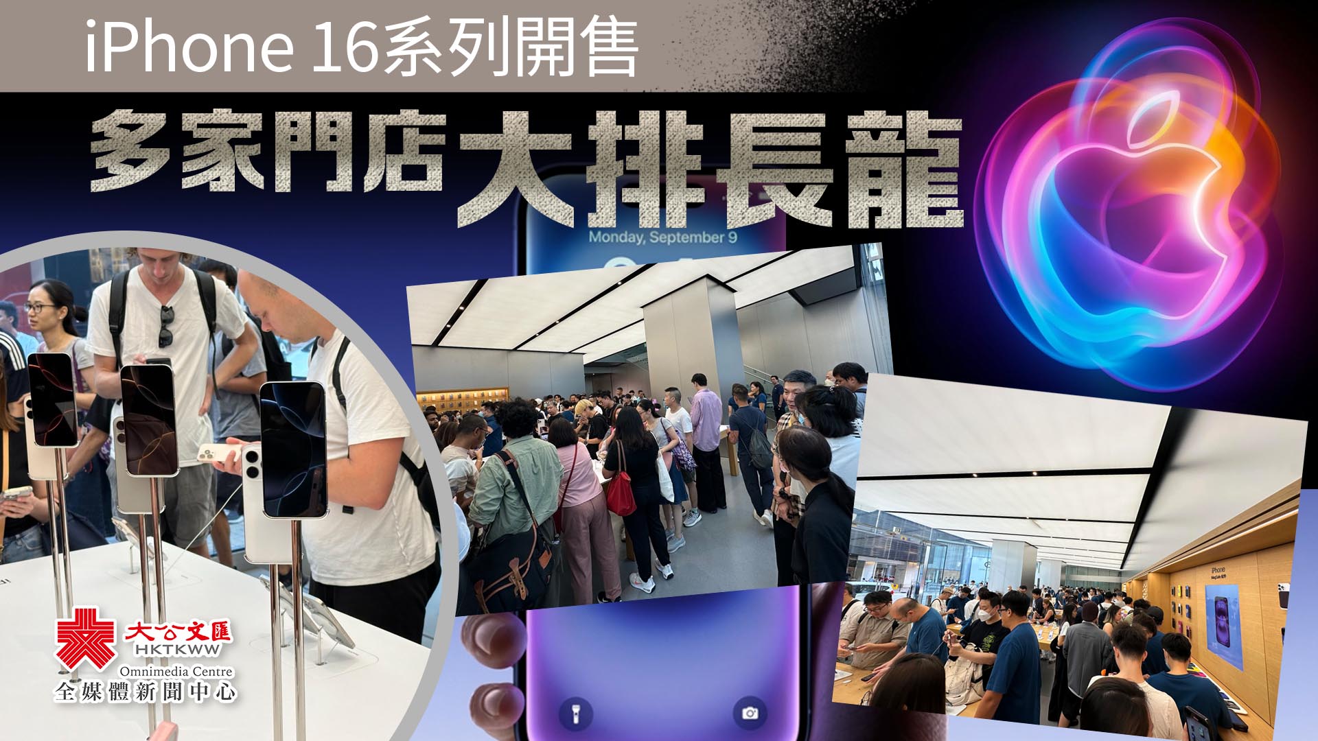 大公文匯全媒體報道,Apple iPhone 16、16 Pro及16 Pro Max系列上周發布及預訂,今早(20日)正式開售。每年新iPhone吸引大批用家及炒家成首批買機人士,今年亦不例外,本港多家Apple Store門前一早已排長龍,店內亦是人頭湧湧。