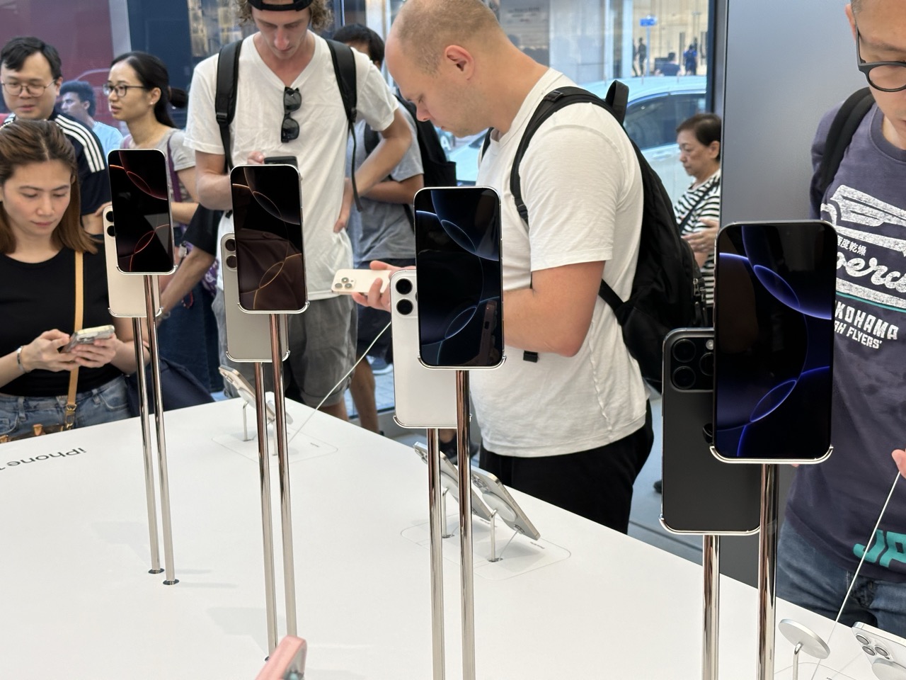 早上未及8時,銅鑼灣希慎Apple Store門外已有近百名顧客等候開門,惟未見到「收機黨」蹤影。排頭位的客人劉生凌晨4時半已到場輪候,連續4年都有訂機的他表示僅訂購一部黑色iPhone 16 Pro 256GB並稱「自用」。