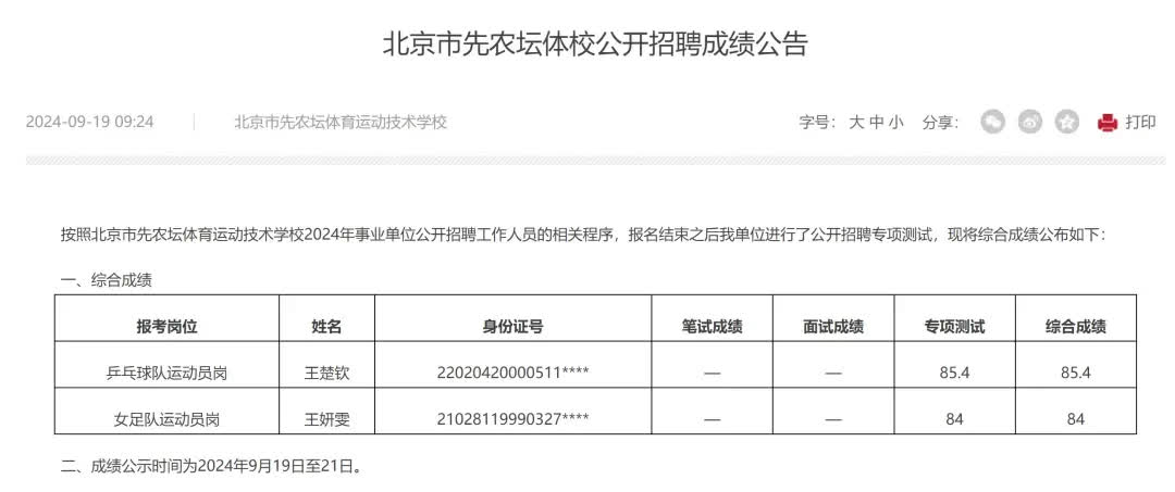 9月19日,北京市先農壇體育運動技術學校發布公開招聘成績公告。公告顯示,乒乓球隊運動員崗報考者為王楚欽,綜合成績為85.4分(總分100分)。女足隊運動員崗報考者為王妍雯,綜合成績為84分。
