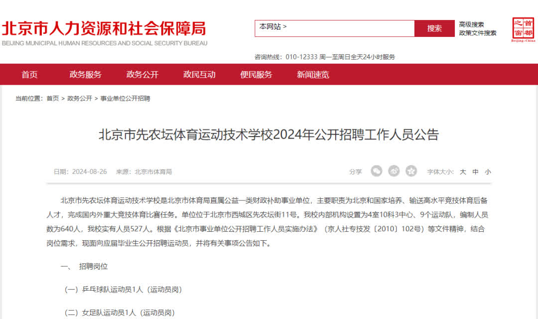 8月26日,北京市人力資源和社會保障局網站發布了一則事業單位公開招聘信息,招聘單位為北京市先農壇體育運動技術學校。
