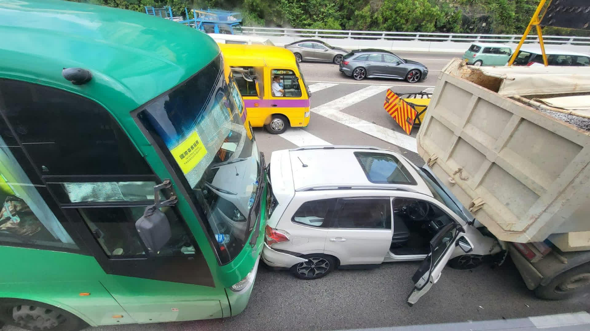 相隔約半小時,下午1時45分青葵公路再發生連環相撞,往九龍方向近港鐵荔景站對開3車發生碰撞,涉及旅遊巴、私家車、泥頭車。其中白色私家車被夾成「三文治」,車頭嚴重損毀。私家車司機頸痛受傷,另外亦有2人報稱受傷,在場接受治理。