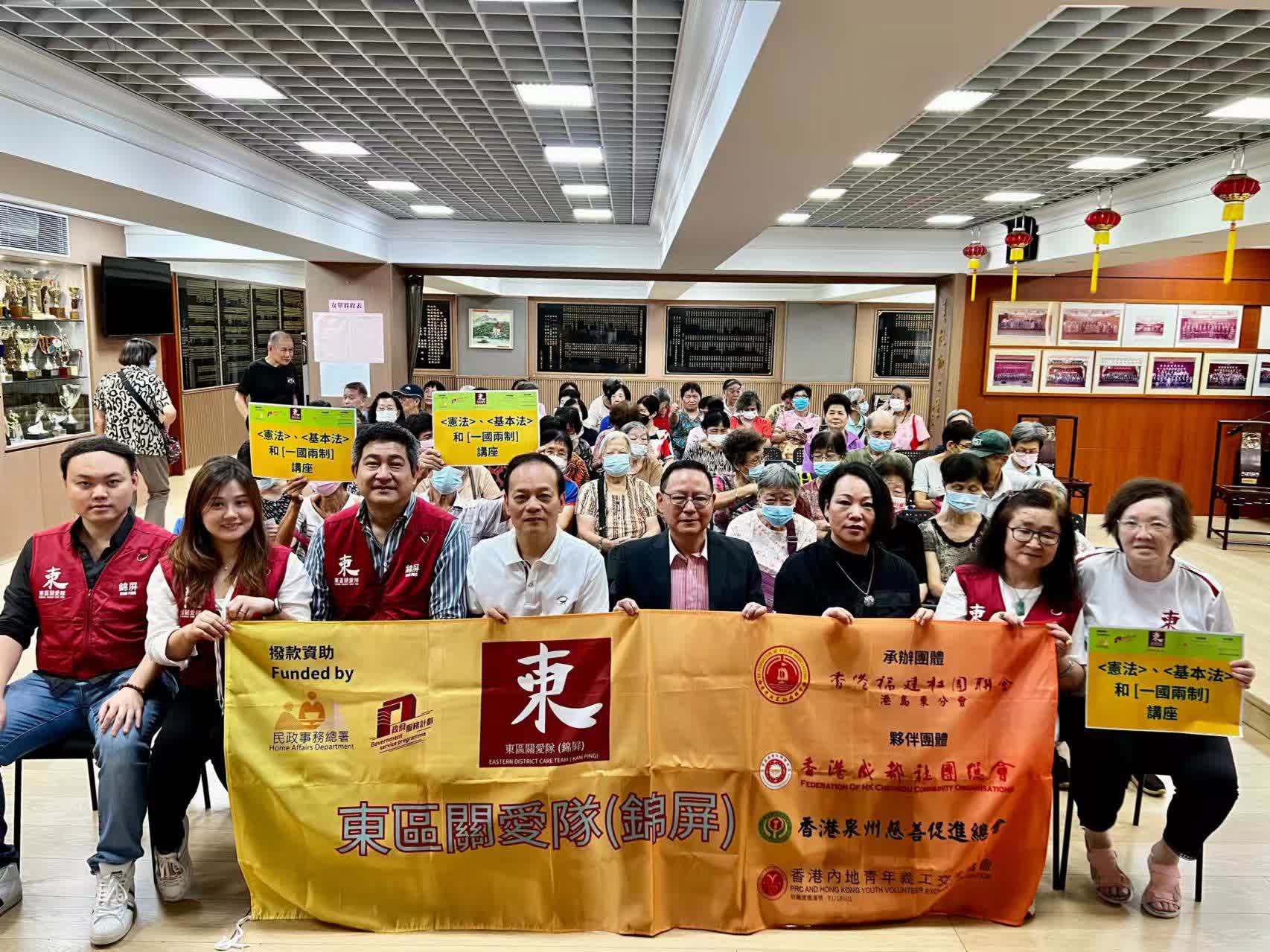大公文匯網報道,9月20日下午,東區錦屏街關愛隊在香港福建體育會會所舉辦「憲法、基本法和『一國兩制』」的講座,由副隊長莊樹煌主持。