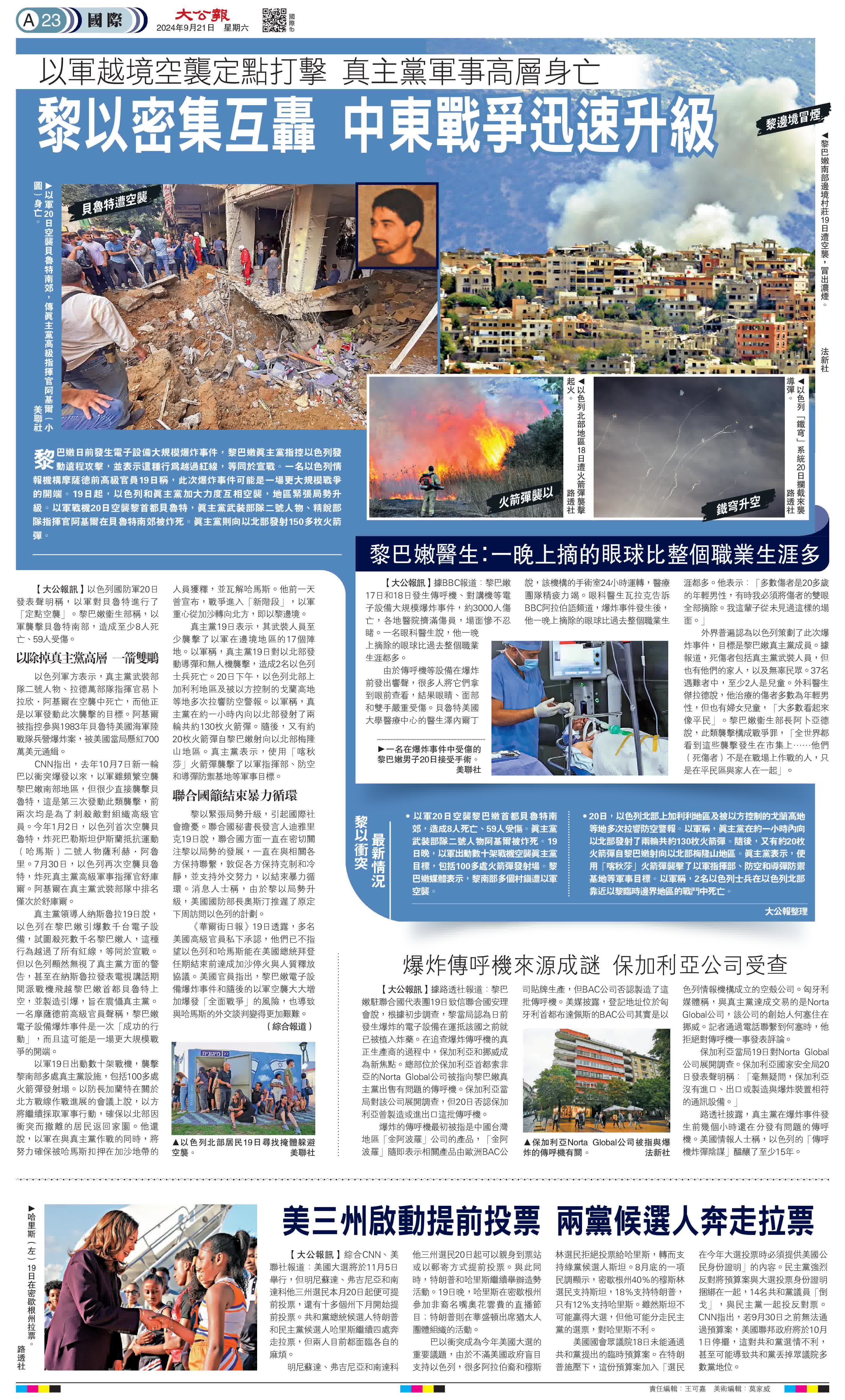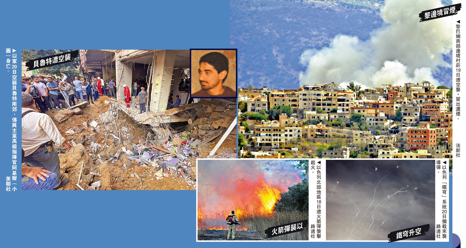 大公報綜合報道,黎巴嫩日前發生電子設備大規模爆炸事件,黎巴嫩真主黨指控以色列發動遠程攻擊,並表示這種行為越過紅線,等同於宣戰。一名以色列情報機構摩薩德前高級官員19日稱,此次爆炸事件可能是一場更大規模戰爭的開端。19日起,以色列和真主黨加大力度互相空襲,地區緊張局勢升級。以軍戰機20日空襲黎首都貝魯特,真主黨武裝部隊二號人物、精銳部隊指揮官阿基爾在貝魯特南郊被炸死。真主黨則向以北部發射150多枚火箭彈。