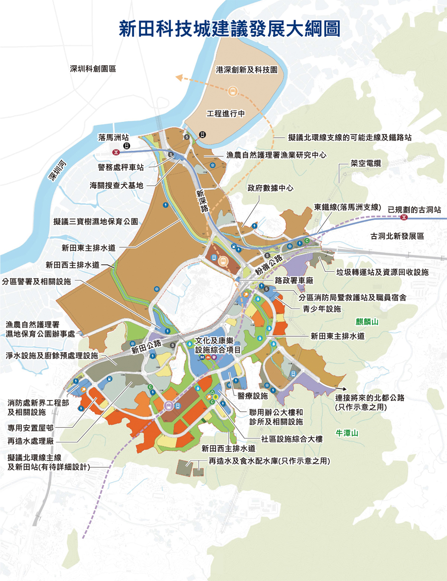 新田/落馬洲地區的規劃不僅提供創新及科技園區,更建立一個自給自足、充滿活力的市中心,以打造一個具有綠色通勤、藍綠網絡和「海綿城市」特色,以及較佳職住平衡的優質新城鎮。約313.24公頃土地劃作「其他指定用途」,其中約210公頃劃作「創新及科技」用途,以發揮區內群聚效應,推動創新及科技發展,滿足日益增加的創新及科技發展用地需求,並深化與內地及全球的創新及科技合作。其他地區除用作住宅及社區等用途外,還包括約207.29公頃的綠化地帶及約139.36公頃的自然保育區地帶。