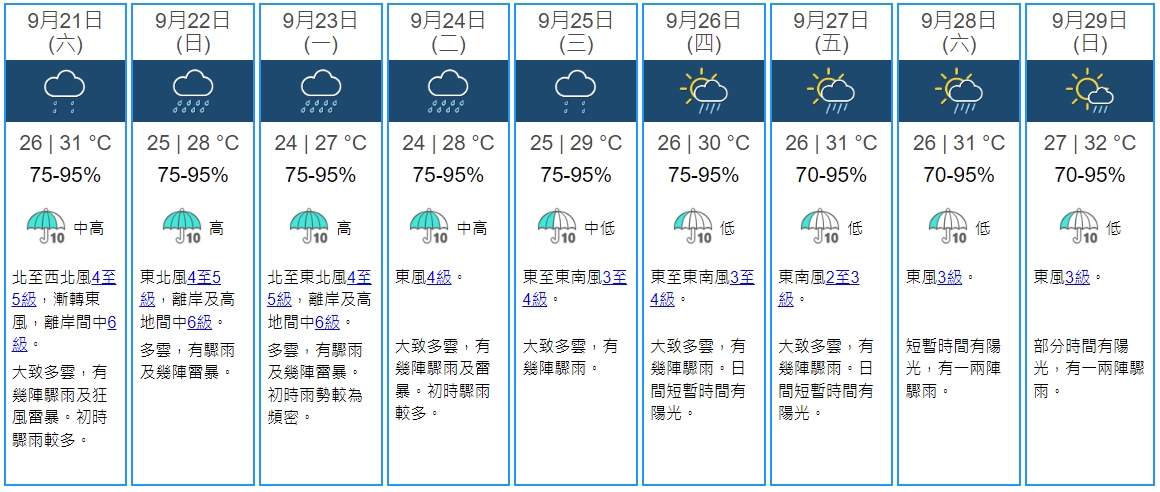 此外,天文台表示,今日本港大致多雲,有幾陣驟雨及狂風雷暴。初時驟雨較多。吹和緩至清勁北至西北風,漸轉吹偏東風,離岸間中吹強風。展望未來,下周初有驟雨,雨勢有時較為頻密,風勢頗大,氣溫逐步下降,星期一及星期二市區最低氣溫在24度左右,新界再低一兩度。
