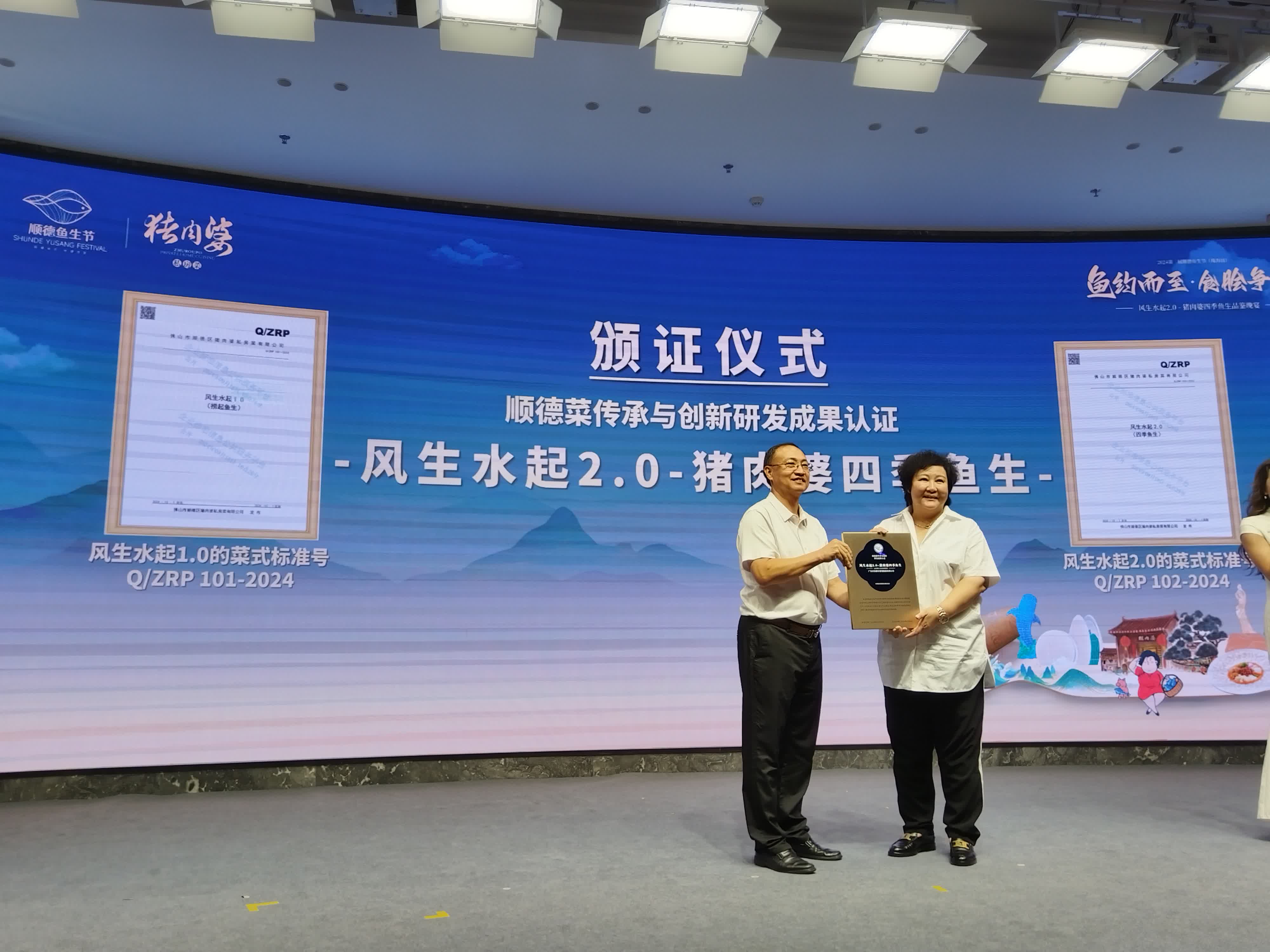 發布儀式上,順德菜發展促進會會長羅兆波將「2024順德魚生節--風生水起2.0認證證書」授予豬肉婆私房菜創始人吳素芬女士。有別於傳統魚生,「豬肉婆四季魚生2.0」按「春芬膾」「夏酯膾」「秋籽膾」「冬松膾」先後上菜。據悉,每道魚生有獨一無二的「身份證」,只要用手機掃一掃二維碼水晶座,就可以看到食用鯇魚的合格報告,包括魚何時開始養殖、在哪裏養、水質指數、出塘時間、合格檢驗報告等資料。