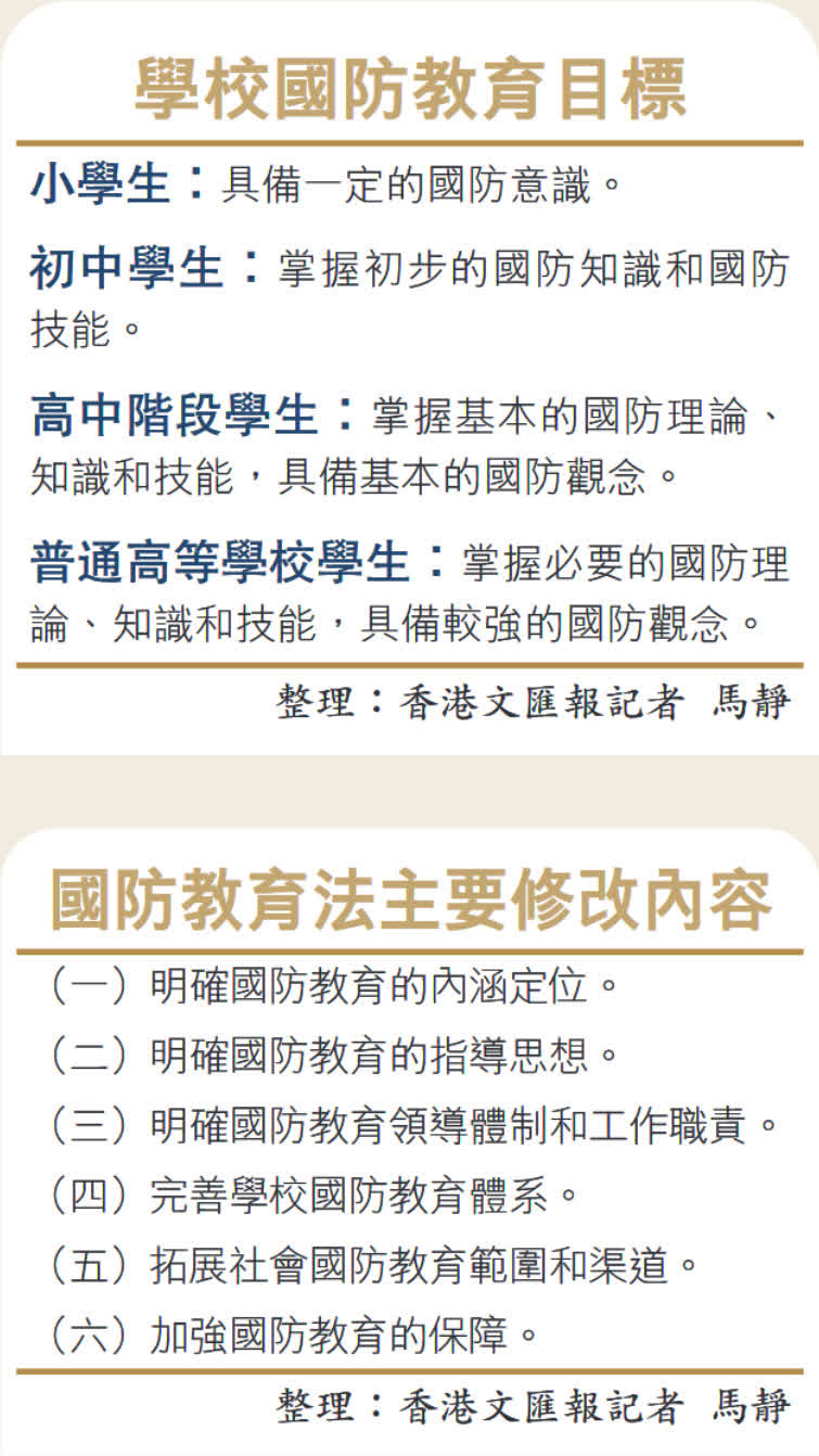 (香港文匯報記者 馬靜 北京報道)十四屆全國人大常委會第十一次會議日前表決通過新修訂的國防教育法,自9月21日起開始施行。新修訂的國防教育法在學校國防教育方面做了「加法」,明確了相關要求,增強了可操作性,其中包括進一步明確了普通高等學校和高中階段學校的學生軍訓相關要求。法律規定,普通高等學校、高中階段學校應當按照學生軍事訓練大綱,加強軍事技能訓練。