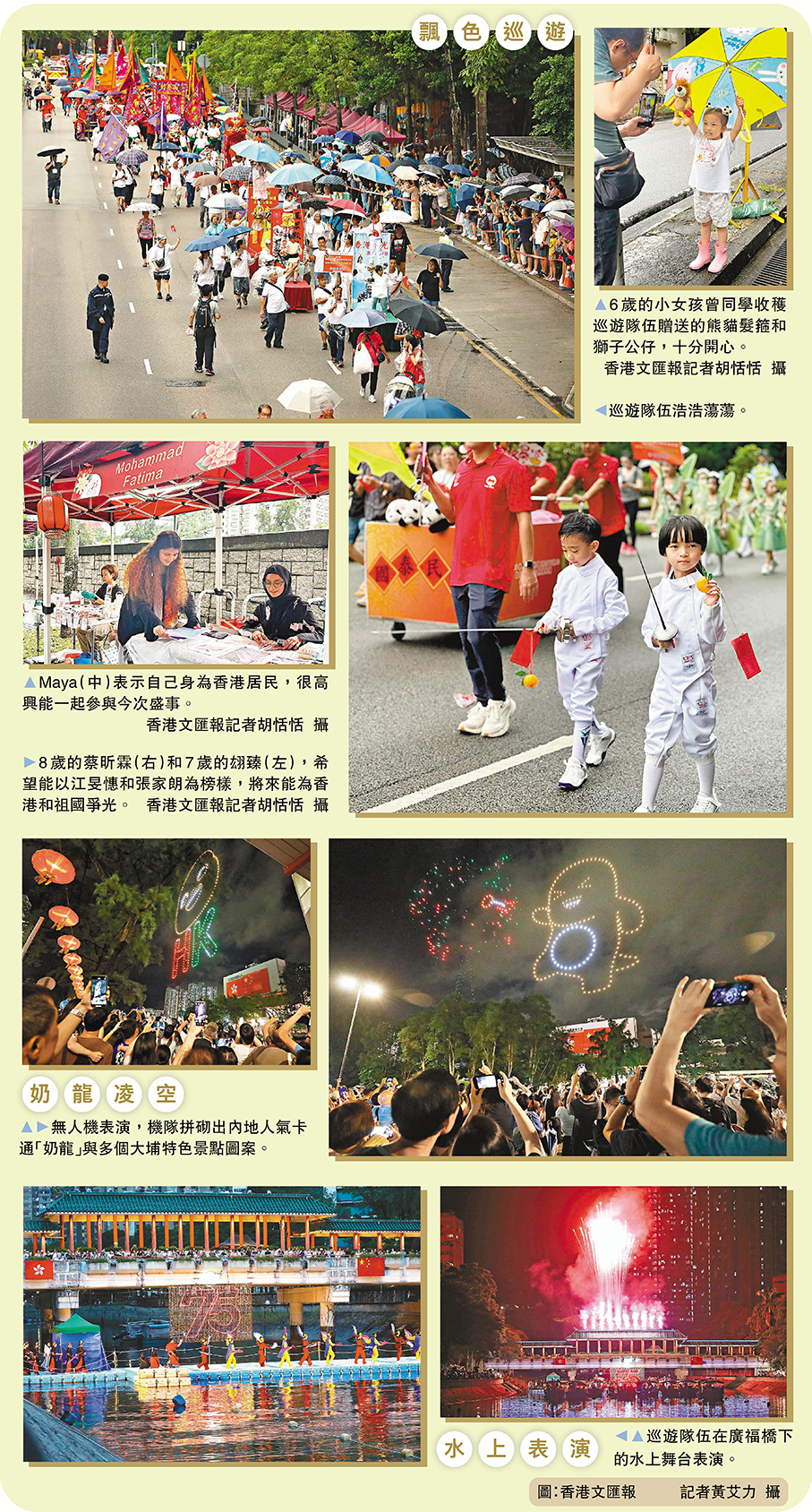 (香港文匯報記者 胡恬恬)為慶祝新中國成立75周年,香港大埔民政事務處及多個大埔區地區團體於9月下旬起至本年底舉行一系列地區慶祝活動,系列活動昨日(21日)在林村河水上舞台舉行巡遊及開幕式,其後還舉行了無人機匯演。有小朋友扮演今年在巴黎奧運獲得金牌的運動員,希望以運動員為榜樣,為香港和祖國爭光。多位參與活動的市民接受香港文匯報訪問時表示,雖然下雨,但阻擋不了大家的熱情,不僅體會到政府對國慶75周年慶祝活動的重視,也感受到濃烈而喜慶的國慶氛圍。