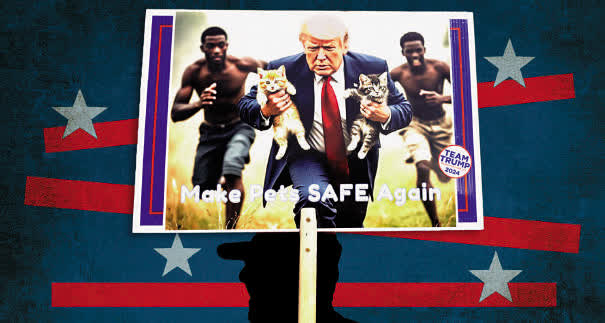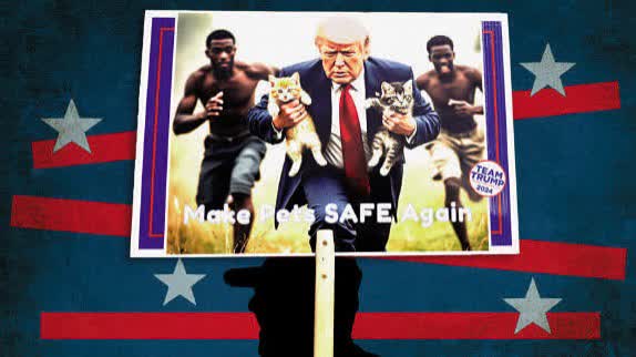 在社媒平台X上,一段由AI生成的圖像組成的視頻顯示,一隻狗舉着一條橫幅,上面寫着「海地人吃了我媽媽」,並在之後的畫面中寫着「投票給特朗普」和「特朗普2024」等標語。另一個標題為「現在俄亥俄州的貓」的視頻顯示,小貓沿着高空鋼絲進行了多次冒險的逃跑。該視頻的配文寫道:「他們在吃貓!他們在吃寵物!」還有AI圖像將特朗普改造成身穿盔甲、手拿劍刃保護寵物貓的「勇士」,告訴選民「如果不想寵物被吃掉,就投票給特朗普」。
