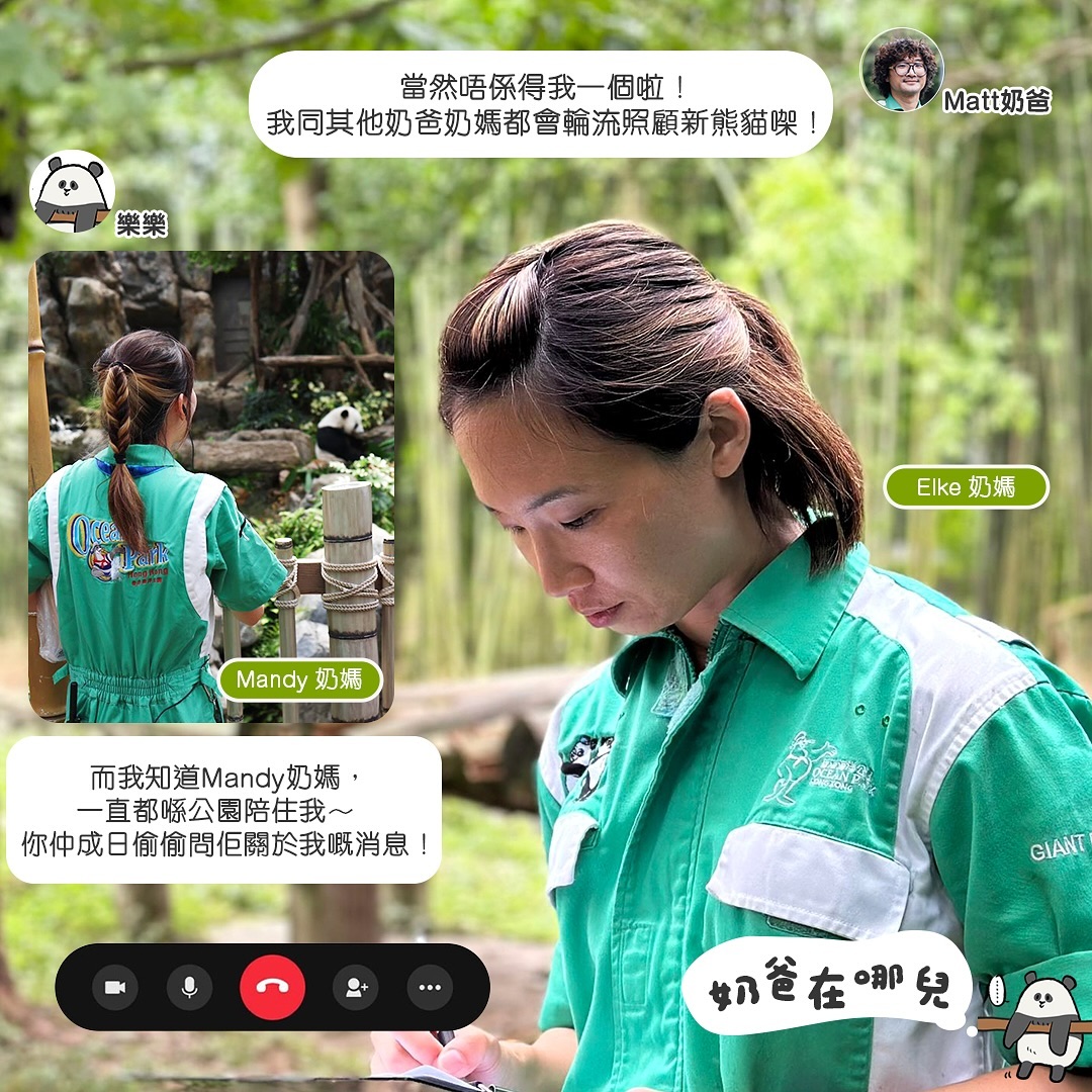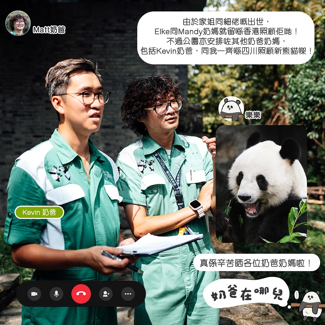 大公文匯全媒體報道,中央贈予香港的一對大熊貓預計將在本月底抵港。海洋公園今日(22日)在社交平台發布《奶爸在哪兒》第三集,大熊貓樂樂和已經前往四川的「奶爸」Matt「視像通話」,透露另一位「奶爸」Kevin也已到達四川照顧即將來港的一對熊貓啦!此外,樂樂和「奶爸」Matt更「講漏嘴」,原來照顧龍鳳胎BB的竟然還有兩位「奶媽」——Mandy及Elke!